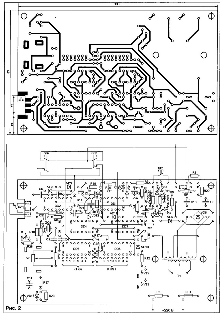 ЭНЦИКЛОПЕДИЯ РАДИОЭЛЕКТРОНИКИ И ЭЛЕКТРОТЕХНИКИ Цифровой кухонный таймер. Энциклопедия радиоэлектроники и электротехники Энциклопедия радиоэлектроники и электротехники / Часы, таймеры, реле, коммутаторы нагрузки Хозяйка ставит блюдо в духовку и вспоминает о нем, лишь когда из духовки повалил дым... Подобная ситуация знакома многим. Избежать ее поможет таймер, который через определенное время подает сигнал, предупреждая, что блюдо в духовке требует внимания. Основное достоинство предлагаемого кухонного таймера - удобство пользования. Пока сетевая вилка вставлена в розетку 220 В, прибор готов к работе, достаточно нажать на кнопку. На индикаторах в любой момент можно увидеть, сколько времени осталось до окончания выдержки. По ее истечении прозвучит звуковой сигнал плавно нарастающей громкости, после чего таймер автоматически выключится, ожидая новой команды. Сетевая вилка может оставаться включенной в розетку постоянно, так как в пассивном состоянии (до начала выдержки и после окончания звукового сигнала) почти все узлы таймера обесточены. От сети в это время потребляется только ток холостого хода трансформатора питания. Принципиальная схема таймера показана на рис. 1. Тактовый генератор собран по типовой схеме на микросхеме К176ИЕ12 (DD2) с кварцевым резонатором ZQ1 частотой 32768 Гц. Его импульсы (с периодом 1 с или 1 мин в зависимости от положения переключателя SA1) поступают на узел отсчета времени - счетчики DD3 и DD4 К561ИЕ14. Они включены таким образом, что работают "на вычитание", поэтому установка выдержки и отсчет времени идут в сторону уменьшения. Элементы DD5, DD6, HG1, HG2 предназначены для дешифрации и индикации остатка времени. К выходам переноса счетчиков DD3 и DD4 подключен элемент совпадения из диодов VD11, VD12 и резистора R24. Низкий логический уровень на ее выходе служит сигналом окончания выдержки. Дифференцирующая цепь R1C1 и пороговый элемент - триггер Шмит-tbDDI.1 - формируют импульс, в течение которого включен звуковой сигнал. Элемент DD1.3 - генератор сигнала звуковой частоты, транзистор VT5 - его усилитель. Частота звука промодулирована импульсами треугольной формы, поступающими через резистор R19 с генератора на элементе DDI.2-Это придает сигналу более заметный, вибрирующий характер. Подстроечным резистором R20 частоту "вибрато" можно изменить. Благодаря цепи R23R27VD13C11 в момент срабатывания таймера сигнал звучит с пониженной громкостью, которая по мере зарядки конденсатора С11 плавно нарастает. Переменным резистором R26 устанавливают максимальную громкость сигнала. Основой узла питания таймера служит трансформатор Т1. Напряжение с его обмотки II, выпрямленное диодным мостом VD6, поступает на стабилизатор (транзисторы VT3, VT4). Падение напряжения на светодиоде HL1 и диоде VD5, через которые в прямом направлении протекает ток нагрузки выпрямителя, увеличивает на 2,3...2,6 В разность потенциалов между катодами и анодами индикаторов HG1 и HG2, что приводит к заметному росту яркости формируемых цифр. Переменное напряжение накала индикаторов поступает от обмотки 111 трансформатора Т1. Когда таймер находится в пассивном состоянии, электронный ключ на транзисторах VT1 и VT2 разрывает цепь накала. Падение переменного напряжения на открытом во время выдержки ключе не превышает 0,15...0,2 В. Поэтому при номинальном для индикаторов ИВ-6 напряжении накала 1 В напряжение на об