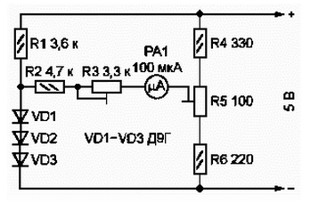 - погрузив диоды VD1-VD3 в сосуд с тающим льдом (снегом), подстроечным резистором R5 устанавливают стрелку микроамперметра РА1 на нулевую отметку шкалы;