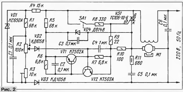 ЭНЦИКЛОПЕДИЯ РАДИОЭЛЕКТРОНИКИ И ЭЛЕКТРОТЕХНИКИ Регулятор электропривода. Энциклопедия радиоэлектроники и электротехники Энциклопедия радиоэлектроники и электротехники / Электродвигатели Регулятор частоты вращения двигателя, стабилизирующий его скорость при изменении нагрузки, существенно повышает эксплуатационные возможности таких бытовых приборов, как электродрель, электропила, кухонный комбайн и т. д. Известен простой и эффективный однополупериодный регулятор коллекторного электродвигателя последовательного возбуждения, стабилизирующий скорость вращения за счет обратной связи по величине противо-ЭДС, возникающей не роторе двигателя и зависящей от его нагрузки. К сожалению, такому регулятору свойствен существенный недостаток - в нем используется высокочувствительный тиристор с током открывания менее 100 мкА. Подобреть ему замену практически невозможно. В публикуемой статье автор предлагает свой вариант схемотехнического решения регуляторе, в котором сняты ограничения не параметры тиристора. Прежде чем перейти к описанию модернизированного регулятора электропривода, остановимся коротко на принципе действия простого регулирующего устройства [1]. Его принципиальная схема приведена на рис. 1. Это - мост, левое плечо которого образовано делителем напряжения сети R1 - R2C1 - VD1, а правое - тиристором VS1 и двигателем М1. Управляющий переход тиристора включен в диагональ моста. Открывающий тиристор сигнал представляет собой сумму складывающихся в противофазе сигналов: напряжения сети, устанавливаемого движком резистора R2, и противо-ЭДС с ротора электродвигателя. При неизменности напряжений мост сбалансирован и частота вращения двигателя также не меняется. Увеличение нагрузки на валу двигателя снижает его обороты и уменьшает соответственно величину противо-ЭДС, что приводит к разбалансу моста. В результате сигнал, поступающий на управляющий переход тиристора, возрастает, и в следующем положительном полупериоде он открывается с меньшей задержкой, увеличивая таким образом подводимую к двигателю мощность. В итоге снижение частоты вращения двигателя из-за увеличения нагрузки оказывается существенно меньшим, чем было бы при отсутствии регулятора. В данном случае регулирование получается весьма устойчивым, так как рассогласование устраняется в каждом положительном полупериоде сетевого напряжения. Более всего эффект стабилизации выражен при малой и средней частотах вращения двигателя. С повышением регулировочного напряжения на резисторе R2 и увеличением числа оборотов двигателя степень поддержания неизменной скорости двигателя ухудшается. Тиристор VS1 в регуляторе выполняет две функции: пороговую - по сигналу рассогласования моста и силовую - по коммутируемому току через двигатель. Диоды VD1, VD2 обеспечивают однополупериодный режим работы устройства, поскольку сравнение напряжений от резистора R2 и противо-ЭДС возможно только при отсутствии тока через двигатель. Конденсатор С1 в делителе напряжения сети расширяет зону регулирования в сторону малых скоростей, а конденсатор С2 в цепи управляющего электрода тиристора понижает чувствительность регулятора к искрению щеток двигателя. Однополупериодный режим двигателя приводит к снижению отдаваемой мощности. Для достижения максимальных мощности и скорости