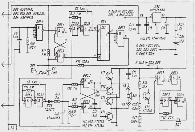 ЭНЦИКЛОПЕДИЯ РАДИОЭЛЕКТРОНИКИ И ЭЛЕКТРОТЕХНИКИ Охранное устройство с ключом-резистором. Энциклопедия радиоэлектроники и электротехники Энциклопедия радиоэлектроники и электротехники / Охрана и безопасность В последнее время возрос спрос на различного рода охранные системы. В предлагаемой статье описано устройство, использующее в качестве ключа резистор определенного номинала. Устройство можно использовать для охраны помещений. В описываемом устройстве применен аналоговый "ключ" - резистор. При подключении к контактам "замка" резистора с заданным сопротивлением режим охраны отключается. Если же дверь открыта без такого "ключа" злоумышленником, устройство сразу подает сигнал тревоги. Следует заметить, что аналоговый "ключ" имеет некоторые недостатки. Например, при повышенной влажности, когда на элементах блока может появиться влага, возможно срабатывание сигнализации при использовании своего "ключа". Этот недостаток тем не менее не позволит злоумышленнику зайти в охраняемое помещение незаметно. В качестве звукового излучателя сирены использована динамическая головка. Питается устройство от аккумуляторной батареи GB1. При снижении питающего напряжения ниже допустимого звучит зуммер. Схема устройства показана на рисунке. Непосредственно перед выходом из помещения хозяин должен установить тумблер SA1 в положение "Охрана". Устройство переходит в режим охраны через 25 с. Перед входом в помещение необходимо вставить в гнезда X1, X2 ответную часть разъема - ключ и вынуть его не ранее чем через 2 с. После этого есть еще 20 с, чтобы зайти и переключить SA1 в положение "Выкл.". Если открыть дверь, не вставляя "ключ", сразу включится сирена. Для досрочного ее отключения необходимо перевести SA1 в положение "Выкл" и нажать кнопку SB1. Особенность системы заключается в необходимости удержания "ключа" в гнезде не менее 2 с. Благодаря этому его сопротивление невозможно подобрать простым вращением переменного резистора. Это объясняется тем, что интервал опознавания "ключа" системой находится в пределах 6...7 кОм. При использовании переменного резистора, например 100 кОм, его надо вращать со скоростью 0,5 кОм/с, чтобы система опознала "ключ". При этом весь резистор прокрутится за 200 с, тогда как на вход в помещение с "ключом" и отключение устройства выделено всего 20 с. Блок А1 - электронный замок. Операционные усилители (ОУ) DA1.1 и DA1.2 включены по схеме компараторов напряжения. Микросхема DD1 используется для подачи сигнала тревоги в блок А2. Делитель напряжения на резисторах R4-R6 задает на выводах 3 и 6 микросхемы DA1 напряжение 4,4 и 3,5 В соответственно. Если "ключ" не вставлен (резистор R1 отключен), делитель R2R3 обеспечивает на выводах 2 и 5 напряжение 5,3 В. При таком включении ОУ, если на неинвертирующем входе напряжение больше, чем на инвертирующем, то на выходе напряжение будет близко к напряжению питания, если, наоборот, на выходе будет напряжение, близкое к нулю. В режиме охраны (резистора R1 нет) на выходе ОУ DA1.1 - 9 В, а на выходе DA1.2 - 0. В результате на резисторе R7 присутствует высокий уровень. Диоды VD3 и VD4 осуществляют развязку выходов ОУ DA1.1 и DA1.2. Конденсатор С1 необходим для защиты от помех на выводах 2 и 5, так как они соединены с входным гнездом. Сопротивление резистора R1 подобрано так, чтобы при его подсоединении к замку напряжение на резисторе R3 было в пределах 3,5...4