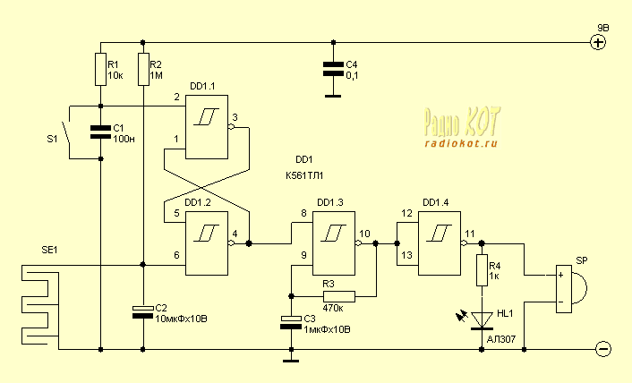 Âñåãî äåëîâ-òî, ÷òî îäíà ìèêðîñõåìà. Êîãäà íàìîêàåò äàò÷èê SE1, íà÷èíàåò ïèùàòü çóììåð è çàãîðàåòñÿ ñâåòîäèîä. ×òîáû âûêëþ÷èòü òðåâîãó íàäî âûñóøèòü äàò÷èê è íàæàòü êíîïêó S1.