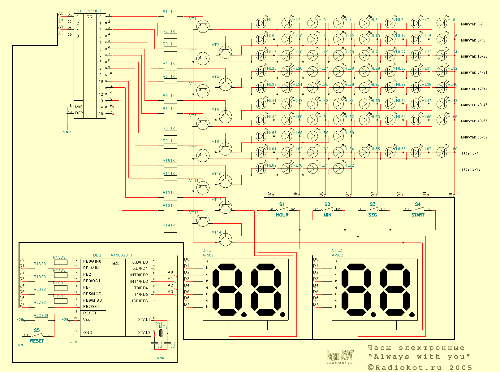 Èñõîäíûé òåêñò ïðîãðàììû êîíòðîëëåðà ïðèëàãàåòñÿ: clock.asm. Áåðèòå, ÿ íå æàäíûé. Åñëè êòî-òî äîâåäåò ñåé äåâàéñ äî óìà - òîæå íå æàäíè÷àéòå, äåëèòåñü.