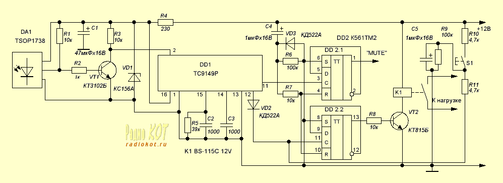ЭНЦИКЛОПЕДИЯ РАДИОЭЛЕКТРОНИКИ И ЭЛЕКТРОТЕХНИКИ Микросхемы TC9148-9150 для дистанционного управления бытовой аппаратурой. Энциклопедия радиоэлектроники и электротехники Энциклопедия радиоэлектроники и электротехники / Часы, таймеры, реле, коммутаторы нагрузки С помощью нижеследующей писанины (писанины много, предупреждаю) мы с Котом (Мяу!) постараемся доходчиво объяснить - как за один вечер сделать себе дистанционное управление аудио- видео- комплексом, буде такой у вас имеется. Есть такая корпорация - называется TOSHIBA - где-то слышали, да? А у этой корпорации есть отделение полупроводников и электронных компонентов. И вот это самое отделение подсуетилось и выпустило три микросхемы - TC9148P, TC9149P, TC9150P. Справедливости ради надо сказать, что суета эта была довольно давно - лет 15 назад, однако, микросхемки получились настолько удачными, что до сих пор на ура применяются где ни попадя. TC9148P - шифратор-передатчик СДУ. Эта микросхема, два транзистора и десяток кнопок - все что нужно для построения полноценного передатчика для СДУ. Микросхема позволяет передать 10 различных команд с возможностью расширения до 18 команд. Напряжение питания может меняться в диапазоне 2,2-5,5 вольта. Потребляемый ток в режиме покоя (ни одна кнопка не нажата) - 10 мкА. Частота передачи - 38кГц. Пробежимся по выводам: 1 Земля