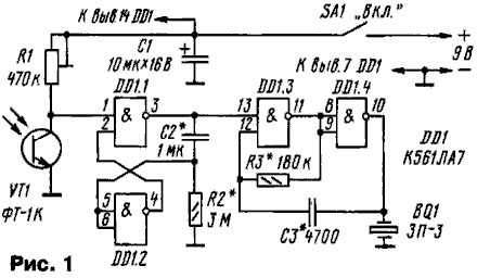 Мишень устроена так, что при попадании в нее луча указки раздается звуковой сигнал. Мишень (рис. 1) содержит фотодатчик на фототранзисторе VT1, ждущий одновибратор на логических элементах DD1.1, DD1.2 и генератор ЗЧ на элементах DD1.3, DD1.4. В исходном состоянии фототранзистор освещен слабо, поэтому на его коллекторе высокий логический уровень. На выходе ждущего одновибратора (вывод 3 DD1.1) низкий логический уровень, генератор ЗЧ не работает.