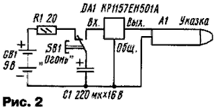 Схема пистолета приведена на рис. 2. В его состав входит лазерная указка А1, интегральный стабилизатор напряжения DA1, накопительный конденсатор С1, кнопка-курок SB1 и батарея питания GB1. В исходном состоянии конденсатор С1 заряжен от батареи питания. При нажатии на кнопку SB1 он подключится ко входу стабилизатора напряжения, в результате чего на лазерную указку поступит питающее напряжение 5 В. Она будет излучать свет в течение короткого отрезка времени (доли секунды), пока конденсатор не разрядится. Если свет попадет в мишень, прозвучит сигнал.
