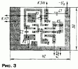 После отпускания кнопки-курка конденсатор снова зарядится - пистолет готов к "выстрелу". Резистор R1 ограничивает зарядный ток конденсатора. Специального выключателя питания в пистолете нет, поскольку в режиме готовности ток от батареи практически не потребляется. Большинство деталей мишени размещают на печатной плате (рис. 3) из односторонне фольгированного стеклотекстолита.