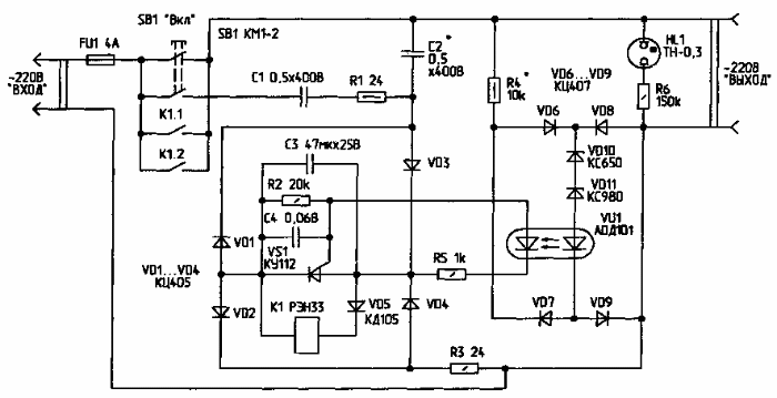 Àâàðèéíîå îòêëþ÷åíèå ïðè ïîâûøåíèè íàïðÿæåíèÿ äî 250  ïðîèñõîäèò áëàãîäàðÿ øóíòèðîâàíèþ îáìîòêè ðåëå òèðèñòîðîì VS1. VS1 îòêðûâàåòñÿ ïîä óïðàâëåíèåì îïòîïàðû VU1. Ñòàáèëèòðîíû VD10, VD11 è ðåçèñòîð R4 ïîäîáðàíû òàê, ÷òî VS1 îòêðûâàåòñÿ ïðè íàïðÿæåíèè ñåòè âûøå 250 Â. Îïòîïàðà VU1 äîëæíà áûòü ñ òîêîì óïðàâëåíèÿ îêîëî 20 ìÀ. Âîçìîæíà çàìåíà åå íåáîëüøèì ðàçäåëèòåëüíûì òðàíñôîðìàòîðîì. Îí âêëþ÷àåòñÿ âòîðè÷íîé îáìîòêîé âìåñòî R2. Ðåëå Ê1 ìîæåò áûòü ëþáîãî òèïà ñ êîíòàêòàìè, âûäåðæèâàþùèìè ìàêñèìàëüíûé òîê íàãðóçêè (ÐÝÑ9, ÐÝÑ22, ÐÝÍÇÇ).