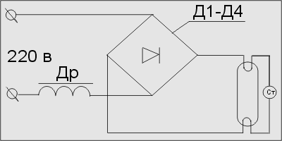 Данная схема включения отличается от стандартной тем что в ней добавлена диодная сборка, которая позволяет избавится от эффекта мерцания лампы и уменьшает время ее зажигания.