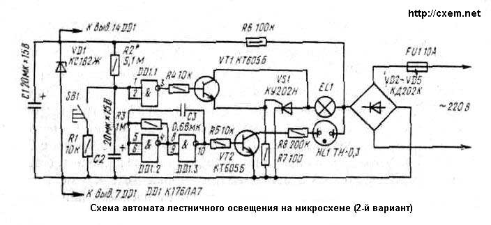 Известно, что на ночное освещение подъездов жилых домов тратится огромное количество электроэнергии, причем большую часть времени свет горит впустую. Чтобы избежать ненужных затрат энергии, необходимо оснастить подъезды домов автоматами, включающими на непродолжительное время свет только тогда, когда в этом есть необходимость. Ниже приведены схемы двух вариантов автоматов лестничного освещения.