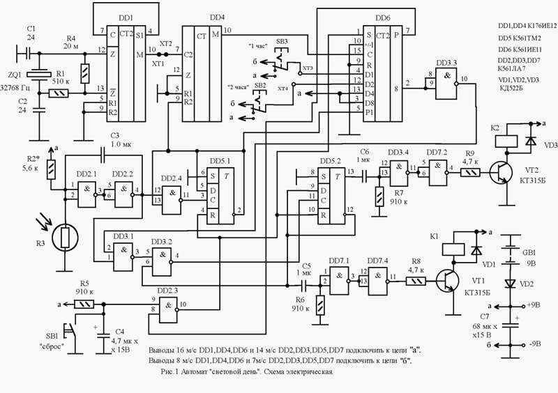 ЭНЦИКЛОПЕДИЯ РАДИОЭЛЕКТРОНИКИ И ЭЛЕКТРОТЕХНИКИ Автомат Световой день для приусадебного хозяйства. Энциклопедия радиоэлектроники и электротехники Энциклопедия радиоэлектроники и электротехники / Освещение В подсобном хозяйстве значительную роль играют приусадебные теплицы. Но зеленый огурчик или цветы к празднику требуют большого труда и умения. Одним из основных параметров для выращивания зимней зелени является освещение. Так, например, для огурца световой день должен составлять 16 часов, а для помидоров - 18 часов [1]. В некоторых теплицах практикуется круглосуточное освещение. Однако для нормального физиологического развития растений требуется несколько часов полной темноты. Существующие автоматы для теплиц [2] позволяют программировать включение и выключение досвечивания в фиксированное время. Например, с 18.00 по 22.00. Однако, как известно, максимальное изменение светового дня происходит в дни близкие к равноденствию (осеннему или весеннему). Это происходит из-за того, что при прохождении солнцем небесного экватора оно имеет максимальную угловую скорость. И наоборот. Минимальное изменение светового дня происходит в дни близкие к солнцестоянию. Само название говорит об остановившемся солнце. Солнце находится в высшей (низшей) точке своей орбиты (эклиптики) и имеет минимальное угловое перемещение. Это небольшое отступление в курс школьной астрономии позволяет лучше понять, почему осенью день уменьшается, а весной - увеличивается. Поэтому основным недостатком существующих автоматов для теплиц является фиксированное время включения и выключения освещения досвечивания. Предлагаемый автомат "световой день" включает освещение при наступлении сумерек и выключает при истечении запрограммированного времени светового дня. Время светового дня задается от 12 часов до 15 часов через один час при помощи двух переключателей. К достоинствам предлагаемого автомата можно отнести и то, что установка фоторезистора не критична к попаданию прямого света от освещения теплицы. Устранена и неопределенность переходного процесса момента включения счетчика. Имеется возможность включения (выключения) освещения в ручном режиме. Данный автомат может найти применение при включении освещения для аквариума и в других случаях, где необходимо продление светового дня, например, в птичнике или в животноводческом помещении. Принципиальная схема автомата: Автомат состоит из задающего генератора и делителя импульсов на микросхеме DD1. Делителя на 60 DD4 и реверсивного счетчика с предварительной установкой DD6; формирователя импульсов на элементах DD2.1, DD2.2; блока управления на микросхемах DD5, DD2.3, DD2.4, DD3.1, DD3.2, DD3.3. Двух формирователей импульсов большой длительности, состоящих из дифференцирующих цепочек C6, R7 и C5, R6; и инверторов на элементах DD3.4, DD7.2 и DD7.1, DD7.4. Ключей на транзисторах VT1, VT2 и реле К1, К2. Работа автомата основана на программировании времени светового дня путем установки кода на реверсивный счетчик DD6 с последующим вычитанием с дискретностью один час. Запуск счетчиков происходит утром, после освещения фоторезистора. После включения напряжения питания на выводе 9 элемента DD2.3 будет логический ноль, а на выводе 10 - логическая единица. Уровень логической единицы с вывода 10 обнуляет триггер DD5, и производит предварительную установку счетчика DD6. 