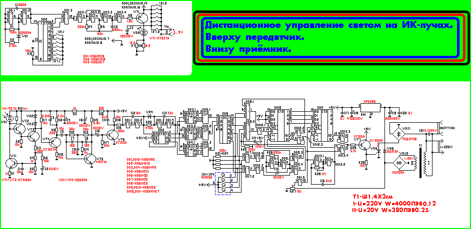 ЭНЦИКЛОПЕДИЯ РАДИОЭЛЕКТРОНИКИ И ЭЛЕКТРОТЕХНИКИ Инфракрасная система управления светом. Энциклопедия радиоэлектроники и электротехники Энциклопедия радиоэлектроники и электротехники / Инфракрасная техника Описание Описываемая здесь система инфракрасного управления обладает повышенной помехоустойчивостью, что достигнуто многократной передачей команд. При этом дешифратор выдает сигнал о приеме соответствующей команды лишь в том случае, когда по крайне мере в двух из трех подряд принятых команд содержится одна и та же информация. Передатчик Для передачи команд используется числоимпульсный код. Шифратор передатчика построен на двух цифровых КМОП-микросхемах серии 561 (рис.1, DD1, DD2). На элементах DD1.1 и DD1.2 собран генератор прямоугольных импульсов, работающий на частоте около 200 Гц. В связи с тем что порог переключения КМОП-элементов не соответствует точно половине напряжения питания, для симметрирования импульсов в традиционную схему генератора добавлены элементы R2 и VD1 . Импульсы генератора подаются на счетчик с дешифраторам (микросхема DD2), нормально имеющий коэффициент пересчета 10. В те моменты, когда счетчик находится в состоянии 0 или 1, на выводах 0 или 1 (выводы 3 или 2 соответственно) присутствует логическая 1, которая запрещает прохождение импульсов генератора через элемент DD1.3 на буферный элемент передатчика. При остальных состояниях счетчика импульсы положительной полярности проходят на буферный элемент передатчика. В результате, если не нажата ни одна из кнопок SB1-SB7, на буферный элемент передатчика приходят пачки из восьми импульсов, разделенные интервалом, равным 2.5 периода импульсов. Передаче таких пачек соответствует отсутствие команд. Рассмотрим, как происходит формирование команд на примере команды, содержащей 5 импульсов. Если нажать кнопку SB5 , счетчик, как и ранее, запрещает прохождение на модулятор первых двух импульсов. Затем на буфер передатчика проходят 5 импульсов, после чего счетчик устанавливается в состояние 7 и на его выходе 7 (вывод 6 DD2) устанавливается логическая 1. Этот сигнал через замкнутые контакты кнопки SB5 поступают на вход R счетчика DD2 и сбрасывает его в 0. В результате на выводе 10 элемента DD1.3 формируются пачки из пяти импульсов, разделенные интервалами такой же длительности что и при отсутствии передачи команды. При нажатии на любую другую кнопку генерируются пачки соответствующим номеру кнопки числом импульсов - от одного до восьми, разделенные таким же интервалом. ИК передатчик представляет собой буферный элемент (DD3.1, DD3.2), генератор несущей частоты (25-30 кГц.)(DD3.3,DD3.4) и усилитель (VT1). Генератор несущей частоты промоделирован по амплитуде пачками импульсов поступающих с шифратора. В коллекторную цепь транзистора VT1 включен ИК излучающий светодиод, он и посылает в пространство точную копию сигнала шифратора. Приёмник Приемник собран по классической схеме принятой в российской промышленности (в частности в телевизорах Рубин, Темп и т.п.). Импульсы ИК-излучения попадают на ИК фотодиод VD1 , преобразуются в электрические сигналы и усиливаются транзисторами VT3, VT4, которые включены по схеме с общем эмиттером. На транзисторе VT2 собран эмиттерный повторитель, согласующий сопротивление динамической нагрузки фотодиода VD1 и транзистора VT1 с входным сопротивлением усилительного каскада на транзис