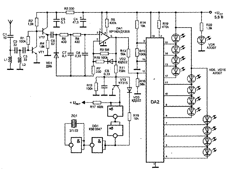 ЭНЦИКЛОПЕДИЯ РАДИОЭЛЕКТРОНИКИ И ЭЛЕКТРОТЕХНИКИ Детектор жучков с логарифмической шкалой на 12 светодиодах и звуковой индикацией. Энциклопедия радиоэлектроники и электротехники Энциклопедия радиоэлектроники и электротехники / Охранные устройства и сигнализация объектов В состав детектора поля входят ФВЧ, усилитель ВЧ, диодный детектор, усилитель постоянного тока с логарифмической зависимостью коэффициента усиления, звуковой генератор с изменяющейся частотой и светодиодная шкала из 12 светодиодов. Детектор способен регистрировать работающие радиомикрофоны в диапазоне частот 20-600 МГц. Принципиальная схема прибора приведена на рисунке. Сигнал, наводимый в антенне, фильтруется ФВЧ на элементах С2,L1, C3, L2 и поступает на широкополосный апериодический усилитель. Последний выполнен на высокочастотном транзисторе VT1 типа КТ3101. Нагрузкой усилителя служит эмиттерный повторитель на транзисторе VT2 типа КТ3101. Сигнал, снимаемый с регулятора чувствительности - резистора R4, поступает через конденсатор С6 на диодный детектор, собранный на диоде VD1 типа Д9Б. Высокочастотные составляющие фильтруются RC-фильтрами R5, С7 и R6, С8. Низкочастотный сигнал поступает на усилитель на микросхеме DA1 типа КР140УД1208. Коэффициент усиления этого усилителя определяется значением резистора R9. При малом уровне входного сигнала усилитель на DA1 имеет большое усиление. По мере увеличения сигнала происходит открывание диода VD2 типа КД522, сопротивление которого изменяется по логарифмическому закону. Это приводит к изменению сопротивления обратной связи также по логарифмическому закону. С выхода усилителя на микросхеме DA1 сигнал поступает на светодиодный индикатор и звуковой генератор. Звуковой генератор выполнен на транзисторе VT3 типа КТ315 и микросхеме DD1 типа К561ЛА7. Конденсатор С9 заряжается через резистор R11 до напряжения открывания транзистора VT3. Это приводит к смене уровня логической единицы на уровень логического нуля на коллекторе транзистора VT3. При этом катод диода VD3 типа КД522 оказывается подключенным через резистор R18 к минусу источника питания. Конденсатор С9 быстро разряжается через цепь VD3, R18,что ведет за собой закрывание транзистора VT3. Конденсатор С9 снова начинает заряжаться и весь процесс повторяется. Прямоугольные импульсы преобразуются пьезокерамическим преобразователем ZQ1 типа ЗП-22 в звуковые. При увеличении напряжения на выходе усилителя DA1 уменьшается время заряда конденсатора С9 до напряжения открывания транзистора VT3, а это, в свою очередь, приводит к увеличению частоты следования импульсов генератора. Таким образом, при увеличении уровня входного сигнала происходит повышение тональности звукового сигнала. Основой светодиодного индикатора является микросхема DA2 типа КМ1003ПП2. Микросхема КМ1003ПП2 является специализированной и выполняет функцию управления светодиодной шкалой, обеспечивая высвечивание столбика на шкале из 12 светодиодов, которые загораются поочередно при изменении входного напряжения от минимального до максимального значения. Яркость свечения светодиодов поддерживается постоянной. Входной сигнал, через делитель напряжения на резисторах R13, R16, поступает на вход микросхемы DA2 (вывод 17). На выводы 16 и 3 микросхемы DA2 подаются уровни опорного напряжения, определяющие, соответственно, минимальное (светодиоды не горят