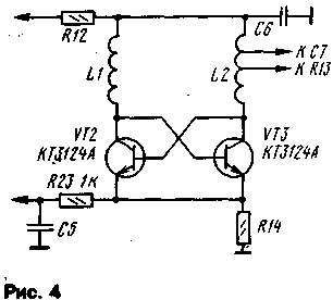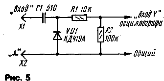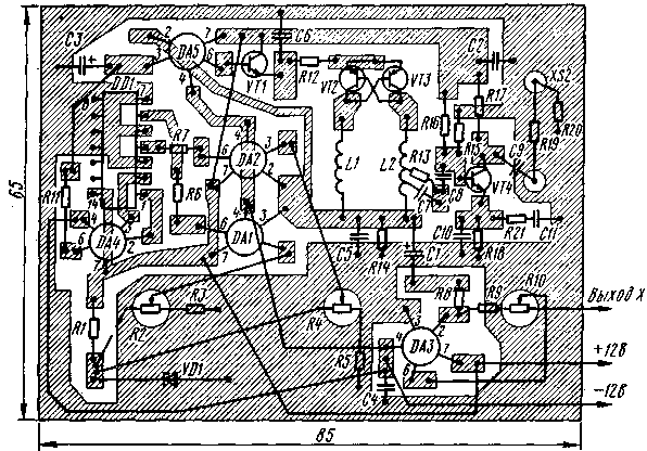 ЭНЦИКЛОПЕДИЯ РАДИОЭЛЕКТРОНИКИ И ЭЛЕКТРОТЕХНИКИ Приставка для измерения частотных характеристик. Энциклопедия радиоэлектроники и электротехники Энциклопедия радиоэлектроники и электротехники / Измерительная техника В последнее время в радиолюбительской практике широко стали применяться визуальные методы проведения контроля характеристик, основанные на использовании панорамных индикаторов. С их помощью удается намного оперативнее производить регулировку таких весьма сложных радиотехнических устройств, как фильтры, усилители, радиоприемники, телевизоры, антенны. Однако приобрести такой прибор промышленного изготовления не всегда возможно, да и стоит он недешево. Между тем, без особых затрат можно сделать аналогичный по функциональному назначению прибор в виде приставки к осциллографу. Такая приставка должна содержать генератор качающейся частоты (ГКЧ), генератор напряжения для развертки осциллографа и выносную детекторную головку. Схема такой приставки показана на рис. 1. При разработке приставки ставилась цель создать простую, малогабаритную и удобную для повторения конструкцию. Правда, из-за смей простоты она, конечно, не лишена некоторых недостатков, но ее и следует рассматривать лишь как базовую конструкцию. По мере добавления других узлов можно будет расширить функциональные возможности и сервисные удобства прибора. Предлагаемая приставка предназначена для настройки различных электронных устройств в диапазоне частот 48...230 МГц, т.е. в телевизионном диапазоне МВ. Однако эта конструкция позволяет изменять диапазон ее рабочих частот, и тогда она сможет работать в диапазоне ДМВ (300...900 МГц), первой промежуточной частоты спутникового телевидения (800...1950 МГц) или на радиолюбительских KB диапазонах. Основное достоинство такой приставки заключается в том, что весь диапазон частот перекрывается с помощью одного ГКЧ (это удобно при настройке широкополосных устройств, например антенных усилителей, селекторов каналов телевизоров и т.п.), предусмотрена возможность установки верхней и нижней частот диапазона качания независимо друг от друга двумя ручками управления. Это позволяет быстро устанавливать необходимый участок рабочего диапазона. К недостаткам же устройства следует отнести нелинейную зависимость напряжения развертки и изменение его амплитуды при изменении диапазона рабочих частот. Приставка состоит из ГКЧ, собранного на транзисторах VT2 VT3, буферного усилителя на транзисторе VT4.Ha элементах DA1, DA2, DA4,001 собран генератор треугольного напряжения, на микросхеме DA5 и транзисторе VT1-стабилизатор тока для питания ГКЧ, а на микросхеме DA3-усилитель напряжения для развертки осциллографа. Генератор ВЧ собран по схеме мультивибратора с индуктивной нагрузкой. Такое схемотехническое решение позволило обеспечить перекрытие всего диапазона (коэффициент перекрытия по частоте примерно 5) без переключении частотозадающих элементов. Достигнуто это изменением тока через транзисторы, при этом изменяются параметры их проводимости и диффузионные емкости, что позволяет варьировать частоту такого генератора в широких пределах. Так, при изменении тока от 50 до 1,5 мА частота изменяется от 48 до 230 МГц. Но для повышения стабильности частоты и возможности управления генератором ВЧ, его следует питать от стабилизатора тока. Уп