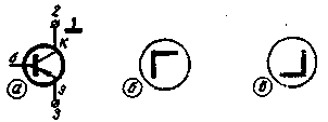 Кремниевые стабилитроны подключают так же, как и все прочие диоды. При напряжении стабилизации ниже 10 в на изображении появится отметка в виде вертикальной черты (рис. 3, г). Селеновые выпрямители подсоединяют так, как полупроводниковые диоды. Типичная осциллограмма показана на рис. 3, д. Испытуемый селеновый выпрямитель можно браковать, если угол на экране имеет очень короткую или очень пологую вертикальную сторону. При подключении туннельных диодов на экране появляется изображение (рис. 3, е) в виде двух почти вертикальных линий с разрывом посредине. Если теперь увеличить усиление по оси "X", то картина на экране изменится (рис. 3, ж). На рис. 3,з показано, как подключают кремниевые управляемые диоды. Управляющий электрод остается свободным. Изображение, появляющееся при этом, показано на рис. 3,и. Возможно небольшое отклонение линии от прямой. Если управляющий электрод заземлить, изображение будет другим (рис. 3, к). Транзисторы. Проверяемые транзисторы подключаются по схеме, изображенной на рис. 4, а. База ни с чем не соединяется. На экране должна появиться прямая или слегка волнистая горизонтальная линия. Если линия изогнута, значит транзистор имеет неустойчивые параметры. Когда в транзисторе имеется короткое замыкание, линия будет вертикальной.