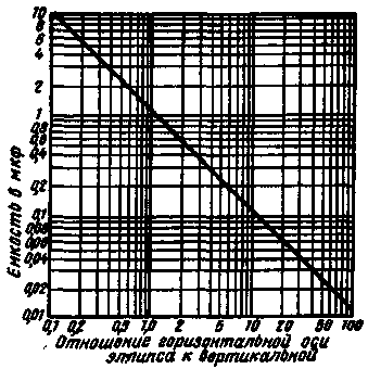 Центральный вывод потенциометра и один из концов присоединяются между зажимами 2 и 3. При вращении ручки потенциометра на экране осциллографа должно наблюдаться изображение в виде поворачивающейся прямой. Неплавное вращение прямой свидетельствует о плохом качестве подвижного контакта. Сопротивление резистора можно определить, воспользовавшись графиком на рис. 5. Фотосопротивления включают между зажимами 2 и 3. Если чувствительный слой фотосопротивления закрыт от света, изображение имеет вид горизонтальной или с небольшим наклоном прямой. Последнее означает, что темновое сопротивление велико. При освещении фотосопротивления прямая должна занять положение, близкое к вертикальному. Величины сопротивлений могут быть определены с помощью графика (рис. 5). По величине сопротивления можно судить и об освещенности. Перед испытанием конденсаторов надо прокалибровать прибор, как описано в начале статьи. После этого включают конденсатор между зажимами 2 и 3. Высококачественному конденсатору должно соответствовать изображение в виде эллипса. Зная отношения длин горизонтальной и вертикальной осей эллипса, можно по графику (рис. 6) определить емкость конденсатора. При емкости равной 1,1 мкФ отношение осей равно 1, и эллипс превращается в круг.