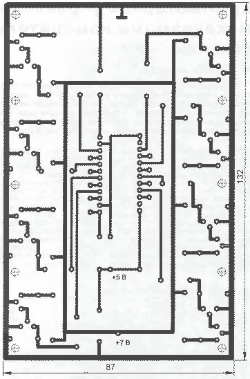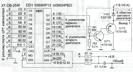 Общая конструкция устройства может быть произвольной. Автор изготавливал опытный образец на печатной плате из фольгированного стеклотекстолита толщиной 2 мм. Чертеж печатной платы и расположение деталей на ней показаны на рис. 2 а б. Печатные проводники должны быть максимально возможной ширины. Простейшие теплоотводы выходных транзисторов могут быть выполнены в виде двух дюралюминиевых пластин размерами 130x50x3 мм; их закрепляют на печатной плате с помощью дюралюминиевых уголков через специально предусмотренные отверстия. Получившуюся конструкцию за теплоотводы фиксируют в корпусе устройства. На рис. 3 приведена фотография одного из вариантов данного устройства, изготовленного автором. На ребристом теплоотводе (справа), кроме транзисторов, также закреплены (через изолирующие слюдяные прокладки) мощные диоды выпрямителя питания. Слева расположены сглаживающие конденсаторы блока питания. Входной и выходные разъемы могут быть закреплены либо на теплоотводах, либо на корпусе устройства. В качестве входного (для соединения с компьютером) использован разъем РПММ1-50Ш1-В. Два выходных разъема (по одному на каждый двигатель) - РГ1Н-1-5, в каждом из которых соединено параллельно по два соседних вывода для снижения токовой нагрузки. Вообще, разъемы могут быть и другие с достаточно мощными контактами. Контакты разъемов соединяют с соответствующими проводниками печатной платы обычным гибким проводом. Для выходных цепей сечение проводов должно быть не менее 1 мм2. Транзисторы КТ815 и КТ818 можно применить с любыми буквенными индексами или использовать другие мощные транзисторы соответствующей структуры. Диоды серии КД213 можно заменить на КД212 или другие мощные импульсные. Тип и мощность применяемых резисторов значения не имеют. Вместо регистра К589ИР12 возможно использование КР580ИР82 с корректировкой печатной платы. Нумерация выводов для этого варианта приведена на рис. 1 в скобках. Следует заметить, что запись данных, подаваемых от параллельного порта компьютера в регистр хранения КР580ИР82, должна производиться по положительному перепаду импульса на входе STB (вывод 11). Для изменения полярности стробирующего импульса в программе предусмотрено соответствующее переключение (пункт меню Slope Positive). Какого-либо налаживания описанное устройство не требует. Необходимо лишь убедиться, что обмотки шаговых двигателей подключены к выходам мощных ключей в должном порядке. Если этого не обеспечить, то ротор двигателя вместо вращения, скорее всего, будет просто вибрировать на месте или поворачиваться рывками. Программы для устройства можно скачать отсюда. Литература