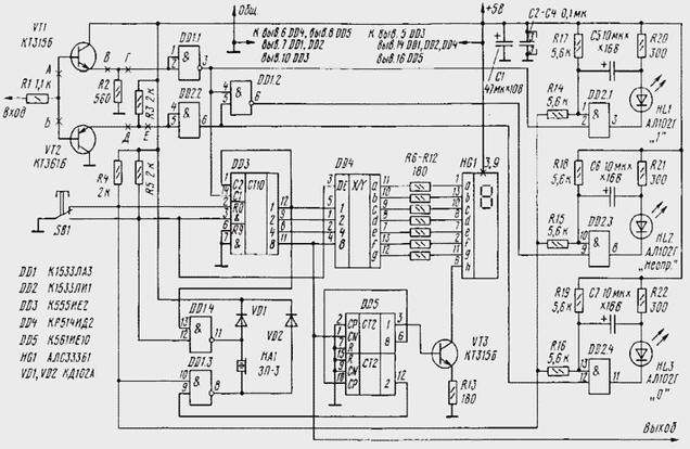 ЭНЦИКЛОПЕДИЯ РАДИОЭЛЕКТРОНИКИ И ЭЛЕКТРОТЕХНИКИ Усовершенствованный логический ТТЛ-пробник. Энциклопедия радиоэлектроники и электротехники Энциклопедия радиоэлектроники и электротехники / Измерительная техника Многолетний опыт работы с цифровыми устройствами позволил автору усовершенствовать пробник, описанный в журнале "Радио" в 1990 г. В результате его модификации, в частности, получена возможность считать и индицировать до 20 импульсов, использовать пробник для слухового контроля частоты и расширения диапазона рабочих частот простого частотомера. Этот пробник будет полезен при налаживании различных электронных устройств на микросхемах ТТЛ. В [1] был описан пробник, определяющий состояние логических цепей и подсчитывающий число импульсов. В нем предусмотрена также возможность слухового контроля частоты колебаний, поступающих на его вход в диапазоне от звуковых частот до 10 МГц. При доработке этого устройства в него были внесены некоторые изменения, упростившие работу с пробником. Во-первых, изменены имевшиеся пороговые значения логических уровней ТТЛ: 0,4 В - лог. 0 и 2,4 В - лог. 1. Эти величины напряжения соответствуют стандартным выходным логическим уровням ТТЛ и позволяют судить о работе микросхемы как источника сигнала. Часто более важно знать, как некоторый уровень в логической цепи воспринимает вход последующей микросхемы. Исходя из этого, пороговые значения напряжения выбраны соответственно входным: 0,8 В и 2 В [3]. Напряжение переключения по входу имеет фиксированное значение, равное 1,5 В, лишь у новых серий микросхем ТТЛ, например, К(Р)1533 и КР1531, а у старых - К155, К555 и КР531 - оно изменяется в некоторых пределах. Таким образом, если иметь в виду только перспективные серии микросхем, то индикация неопределенного состояния практически не нужна - можно считать, что лог. 0 - это напряжение ниже 1,5 В, а лог. 1 - соответственно, выше 1,5 В. Но так как старые серии микросхем будут работать еще много лет, в этом пробнике была оставлена индикация неопределенного состояния. Во-вторых, в исходном устройстве неудобно для восприятия размещена индикация числа поступивших на вход логических импульсов (в двоичном коде). Многие ли могут быстро перевести число импульсов, выраженное двоичным кодом, в десятичное? Неудобен и выбор коэффициента деления частоты входных импульсов для прослушивания на головной телефон. С учетом этих замечаний схему пробника пришлось несколько изменить. Теперь он содержит пять микросхем и один семисегментный индикатор (см. рисунок). Пробник тремя светодиодами отображает логические состояния входа: ноль, неопределенное состояние индикатора и единицу. Время индикации коротких импульсов удлиняется, чтобы была обеспечена возможность успеть оценить их визуально. Если растягивание импульсов отключить, то по сравнительной яркости светодиодов можно судить о скважности и прямоугольности входного сигнала. Для определения числа поступивших на вход импульсов пробник снабжен счетчиком и цифровым индикатором, отображающим цифры - от 0 до 9. Включение десятичной точки использовано в целях индикации единицы переноса в старший разряд. Таким образом, обеспечивается фиксация последовательности до двадцати импульсов. При необходимости счетчик можно сбросить, чтобы удобнее было вести дальнейший отсчет. Пробник позволяет та