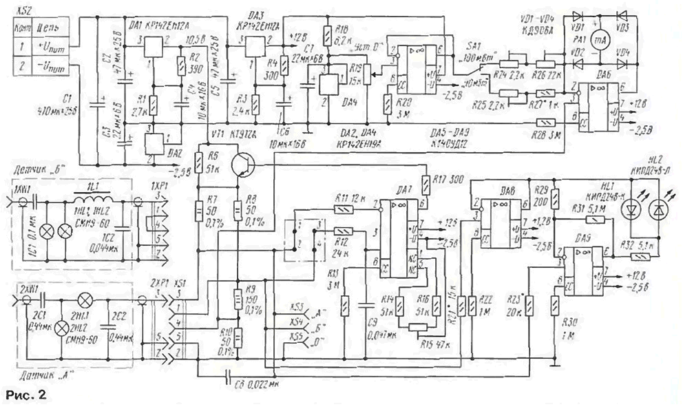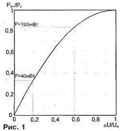 ЭНЦИКЛОПЕДИЯ РАДИОЭЛЕКТРОНИКИ И ЭЛЕКТРОТЕХНИКИ Высокачастотный ваттметр и генератор шума. Энциклопедия радиоэлектроники и электротехники Энциклопедия радиоэлектроники и электротехники / Измерительная техника Предлагаемая конструкция высокочастотного ваттметра разработана на основе двух приборов, описанных в [1, 2], где рассмотрена возможность применения миниатюрных ламп накаливания в измерительной аппаратуре. Помимо простоты конструкции и доступности используемых элементов датчика, автора привлекло то обстоятельство, что настройка подобного широкополосного прибора не требует высокочастотных измерений. Необходимо иметь только цифровой трех- или четырехразрядный мультиметр. Все измерения проводят на постоянном токе. Основное отличие предлагаемой конструкции ваттметра состоит в том, что измерительный мост, к которому подключают датчик-преобразователь на лампах накаливания, балансируется автоматически в процессе работы. Ваттметр, схема которого рассмотрена ниже, можно использовать и как стабильный генератор шума с согласованным выходным сопротивлением 50 Ом. Поскольку прибор имеет узел автоматической стабилизации сопротивления (АСС) датчика, температура нити накаливания также стабилизирована с высокой точностью. По уровню шумов можно косвенно судить о рабочей полосе частот прибора. Шумы ламп простираются до 1 ГГц. и падение уровня начинается на частотах 600...700 МГц, что соответствует данным, приведенным в [1, 2]. О генераторах шума и проведении измерений с их помощью можно прочитать в [3, 4]. В процессе экспериментов выяснилось, что лампы накаливания оказались весьма чувствительны к механическим воздействиям. На практике это означает, что прибор следует оберегать от сотрясений, иначе параметры преобразователя могут скачкообразно изменяться. Происходит это, по-видимому, из-за смещения нити накаливания и изменения режима теплопередачи. Наиболее устойчивым уровнем, как показали испытания, оказывается тот, на который датчик выходит после включения питания. Поскольку узел АСС работает весьма стабильно, переход на другой уровень Рл легко определяется по стрелочному индикатору как сдвиг "нуля". Если требуется точное измерение, нужно выключить и снова включить напряжение питания. Стабильность датчика, не связанная с механическими воздействиями, довольно высокая: в течение суток у прибора не обнаружено смещения нуля и предела (по стрелочному индикатору), чего не бывает, к примеру, у промышленного милливольтметра ВЗ-48. Основы примененного метода измерения ВЧ мощности изложены в [1, 2]. Обозначения в тексте соответствуют принятым в исходных статьях. Суммарная мощность, нагревающая нити ламп, Рл = Рвч + Pзам. ( 1) где РВч - высокочастотная мощность. Рзам - замещающая мощность постоянного тока [2]. Преобразуем выражение (1): Рвч = Рл - Рзам = (Uл2 - Uзам2)/R = (2Uл·ΔU-ΔU2)/R. (2) где ΔU = Uл - Uзам; Рл = Uл2/R; Рзам = Uзам2/R: R = 200 Ом (или 50 Ом для датчика с параллельным включением ламп, см. ниже). Из выражения (2) следует, что значение ВЧ мощности на входе датчика является функцией разности напряжений ΔU = Uл- Uзам. Именно эту разность напряжений (при условии баланса моста) измеряет ваттметр. Формулу (2) можно представить в нормированном виде: Рвч/Рл = 2ΔU/Uл - (ΔU/Uл)2 (3) Вид функции (3) приведен на рис. 1. Используя приведенный на нем график или аналитическое выражение (3)