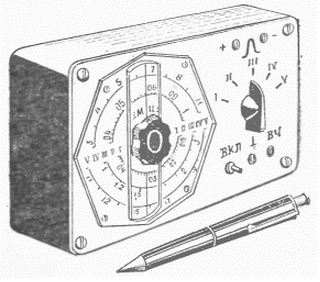 Размещение деталей и монтаж платы производят согласно рисунку. Цифрами обозначены точки соединения элементов платы с другими деталями схемы. Переднюю панель прибора вырезают из алюминия толщиной 2-3 мм. На заготовке высверливают отверстия, обрабатывают лицевую сторону мелкозернистой наждачной бумагой в продольном направлении до образования ровной матовой поверхности с легкими рисками. На промытую и просушенную панель краской наносят надписи и покрывают тонким слоем бесцветного лака. Шкалу прибора делают из плотной бумаги. Тушью наносят пять полуокружностей, по числу рабочих диапазонов, и другие надписи. Бумажную шкалу закрывают наличником из органического стекла толщиной 1-2 мм. Визирный указатель изготовляют также из оргстекла, но толщиной 2,5-3 мм. Посредине полоски делают глубокую тонкую риску, которая должна хорошо просматриваться на фоне шкалы. В местах, соответствующих размещению полуокружностей на шкале, высверливают отверстия 1 мм, необходимые для нанесения опорных точек при градуировке. Указатель укрепляют на ручке. Ось переменного конденсатора удлиняют. Для гальванического элемента изготовляют контактные пружины, обеспечивающие его электрическое соединение со схемой. Корпус прибора пластмассовый или деревянный. Собрав и проверив монтаж, приступайте к налаживанию и градуированию шкалы частотомера. Для их выполнения нужен промышленный генератор стандартных сигналов типа ГСС-6, Г4-1а, Г4-І8 или хорошо отградуированный любительский аналог. Налаживание начинают с проверки работоспособности частотомера на всех диапазонах. Для этого через гнезда Г1 и Г2 вход прибора соединяют с выходом генератора. К гнездам Г3 и Г4, соблюдая полярность, подключают микроамперметр постоянного тока на 100-200 мкА. Поставив переключатель П в положение 1, а визирный указатель на середину шкалы, проверяют первый диапазон частотомера. Для этого, подавая с генератора высокочастотное напряжение величиной 100-200 мкВ и перестраивая частоту в пределах 15О-430 кГц, находят момент совпадения настроек приборов, момент резонанса зафиксирует микроамперметр. Если стрелка индикатора отклоняется на незначительный угол, то надо сменить транзистор. Нормальным считается такое положение, когда в момент резонанса стрелка отклоняется не менее чем на две трети шкалы. Проверив работоспособность частотомера на других диапазонах, приступают к укладке граничных частот. Начинают это опять с первого диапазона. Визирный указатель ставят в положение максимальной емкости переменного конденсатора. С генератора подают низшую частоту диапазона, равную 150 кГц, и вращением подстроечного сердечника катушки L1 настраивают контур в резонанс. После этого изменяют емкость конденсатора С2 на максимальную и, подавая сигнал с частотой 430 кГц, вращением ротора конденсатора С3 снова добиваются резонанса. Так же выполняют укладку границ и на остальных диапазонах. Вполне допустимо положение, когда границы диапазона получаются на 10-20% шире нормы. Закончив укладку, приступают к градуировке шкалы. Первый диапазон можно проградуировать через каждые 10 кГц, второй до 0,6 МГц - также через 10 кГц, а остальную часть и третий диапазон - через 50 кГц. Четвертый до 6 МГц - через 100 кГц, а остальную часть и пятый - также через 0,5 МГц. Для удобства работы с частотомером надо выделить метки стандартной 