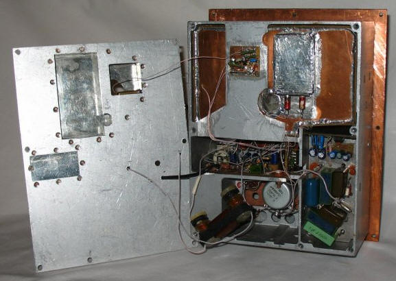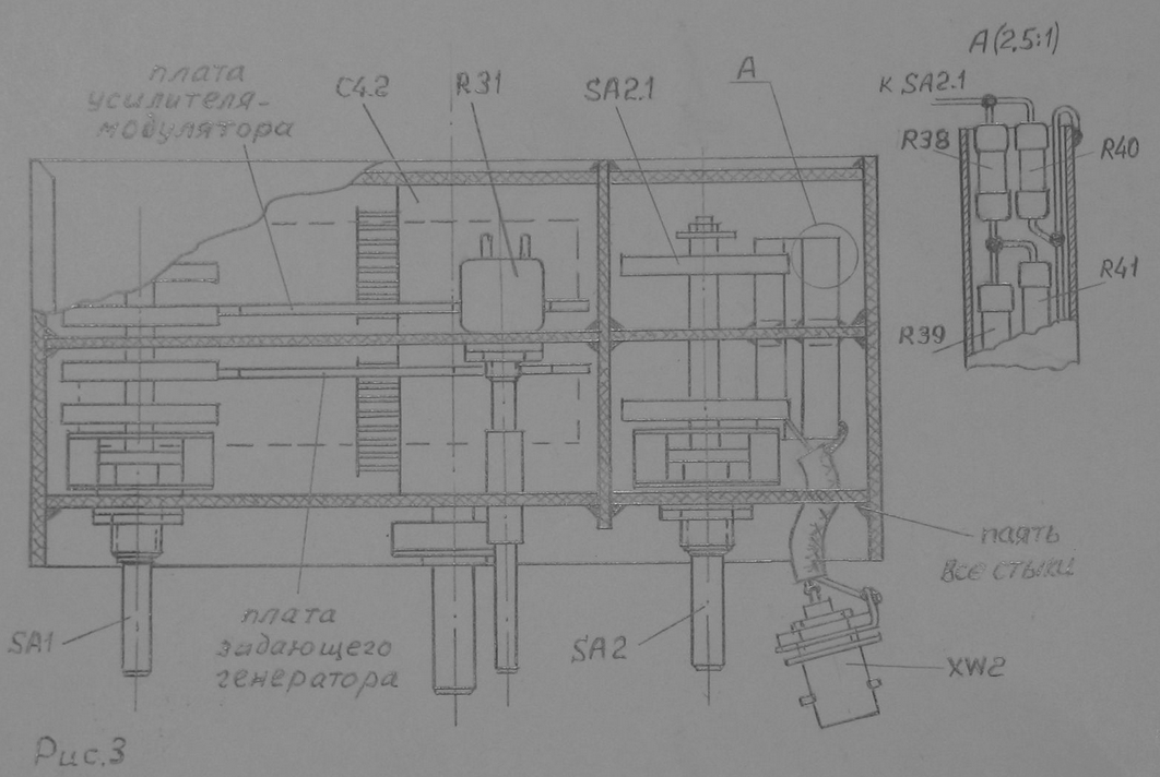 Верхняя шкала отградуирована в эффективных значениях, нижняя в процентах модуляции. Переключатель выхода вольтметра сблокирован с выключателем ГРЧ и при обесточивании последнего вход вольтметра переключен к выходу ГЗЧ. По верхней шкале проводится отсчет напряжения звуковой частоты на выходе XS4 “x1". Если включается ГРЧ, вольтметр подключается к выходу детектора, вернее к его делителю R86. При отсутствии модуляции стрелка измерителя должна четко быть против отметки 1В по верхней шкале и против 0% по нижней на любой частоте, что говорит о нормальной работе схемы стабилизации амплитуды выходного напряжения ГРЧ. При увеличении от нуля выходного напряжения ГЗЧ по нижней шкале отсчитывают глубину модуляции. В любом случае выходное напряжение ГРЧ отсчитывают по шкале регулятора R31 “mV" и умножают на показания аттенюатора и выходного делителя. У примененного пикового вольтметра имеется некоторый недостаток, который нужно учесть в работе. Сказывается инерционность DA5 на частотах более 10кГц: на частотах 20кГц завал 1дБ, на частоте 100кГц - 2дБ. При измерении выходного напряжения ГРЧ это не сказывается, так как там свой детектор. ГРЧ и ГЗЧ имеют отдельные выключатели питания. Каскад VT13 коммутирует минус 12В для ГРЧ в связи с недостачей контактов SA4. Питание задающего генератора и усилителя - модулятора +8В обеспечивает микросхемный стабилизатор DA1. Все основные узлы ГРЧ размещены в блоке ВЧ с двойным экранированием. Блок ВЧ размерами 132х62х90мм спаян из двухсторонне фольгированного стекло текстолита толщиной 1,5мм. Конструкция блока ВЧ (вид сверху) показано упрощенно на рис.3. Верхняя, нижняя и боковые стенки спаяны при помощи четырех уголков из белой жести, наложенных на углы. Продольной перегородкой генератор отделен от аттенюатора, а они в свою очередь разделены поперечными перегородками на отсеки, стыки пропаяны. После монтажа и отладки крышки отсеков пропаяны. Внешние боковые стороны блока ВЧ не имеют электрического контакта с внутренними экранами. В перегородку аттенюатора впаяны тонкостенные латунные трубки длинной около 32мм и внутренним диаметром около 5мм от колена телескопической антенны. Внутри трубок помещены резисторы аттенюатора как показано на выноске А рис.3. Для корпуса ГСС использован литой корпус неизвестного назначения из алюминиевого сплава, с передней и задней крышками, с внутренними перегородками. Блок ВЧ помещен внутри этого корпуса, внутренний экран блока соединен с внешним корпусом в одной точке внешней оболочкой отрезка ВЧ кабеля, соединяющего выход аттенюатора с выходным гнездом XW2. Гнездо XW2 размещено на лицевой крышке внешнего корпуса. Оси органов управления ГРЧ изолированы от внешнего корпуса изолированными удлинителями или трубками. Блок КПЕ (от "Спидолы") через фрикцион связан с ручкой плавной установки частоты. Монтаж выполнен небольшими функциональными модулями на платах из двухсторонне фольгированного стеклотекстолита планарно. Печатные платы не разрабатывались. Дорожки и контактные площадки вырезались резаком. Данные катушек контуров помещены в табл. 1. Таблица 1 Катушки поддиапазонов 1…3 помещены в броневые сердечники из карбонильного железа СБ-12а и намотаны внавал на трехсекционных каркасах, а поддиапазонов 4 и 5 - намотаны однослойно на полистироловые каркасы ø5,5 мм, имеющие подстроечники и