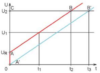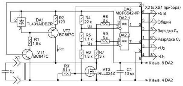 Схема приставки изображена на рис. 1. По сравнению с [3] в нее внесены следующие изменения: - удалены диоды, которые должны защитить элементы устройства от повреждения при подключении к нему заряженного конденсатора большой емкости. Причин две. Во-первых, по мнению автора, свою защитную функцию они выполняют весьма ограниченно. Например, от случайно подключенного к устройству конденсатора емкостью несколько тысяч микрофарад, заряженного до напряжения 50 В и более, они все равно не спасут. Во-вторых, диоды не позволяют сделать напряжение на измеряемом конденсаторе большим, чем уровень их открывания. При отказе от диодов защитную функцию в тех же пределах можно реализовать с помощью транзистора VT3 при должном управлении им со стороны микроконтроллера. А с точки зрения безопасности работы с прибором правильным будет, прежде чем подключать к прибору конденсатор большой емкости (особенно высоковольтный), обязательно разрядить его; - в приставке использован только один генератор стабильного тока (ГСТ), который обеспечивает измерения во всем указанном выше интервале емкости. Он отличается от исходного более высокой стабильностью выходного тока. Это достигнуто за счет применения в нем параллельного интегрального стабилизатора напряжения повышенной точности и транзистора с большим коэффициентом передачи тока базы. Кроме того, увеличен выходной ток ГСТ, что уменьшило погрешность измерения (особенно ЭПС), связанную с током утечки конденсатора. Управление работой приставки, обработку поступающих от нее сигналов и необходимые расчеты выполняет микроконтроллер комбинированного прибора. Отсчет интервалов времени ведут его 32-разрядные таймеры, тактируемые с частотой 32 МГц, что обеспечивает не только высокую точность измерений, но и большой теоретический верхний предел измеряемой емкости (несколько фарад). Однако достижение такого предела на практике затруднено тем, что скорость нарастания напряжения на измеряемом конденсаторе с увеличением его емкости становится очень малой, вследствие чего растет погрешность определения компаратором момента достижения порога. Поэтому максимальная измеряемая емкость программно ограничена значением 99999 мкФ, чего вполне достаточно для большинства практических целей. После подключения приставки к прибору и перевода его в режим измерения емкости и ЭПС микроконтроллер открывает транзистор VT3 и закрывает транзистор VT1, чем выключает ГСТ. На инвертирующие входы компараторов микросхемы DA2 поданы образцовые напряжения с делителя R4-R6, задающие пороги их срабатывания (U1≈0,25 В; U2≈0,5 В). На выходах обоих компараторов в исходном состоянии установлены логически низкие уровни напряжения. Далее измеряемый конденсатор Cx подключают к разъему X1 приставки и нажатием соответствующей клавиши на приборе запускают процесс измерения. В течение первых трех секунд после запуска программа удерживает транзистор VT3 в открытом состоянии, чтобы удалить возможный остаточный заряд измеряемого конденсатора, после чего закрывает этот транзистор и открывает транзистор VT1, включая ГСТ. С этого момента выходной ток ГСТ Iст начинает заряжать конденсатор Cx. Входной ток компараторов можно не учитывать, так как по сравнению с Iстон чрезвычайно мал. В процессе зарядки напряжение на конденсаторе растет по линейному закону. Од
