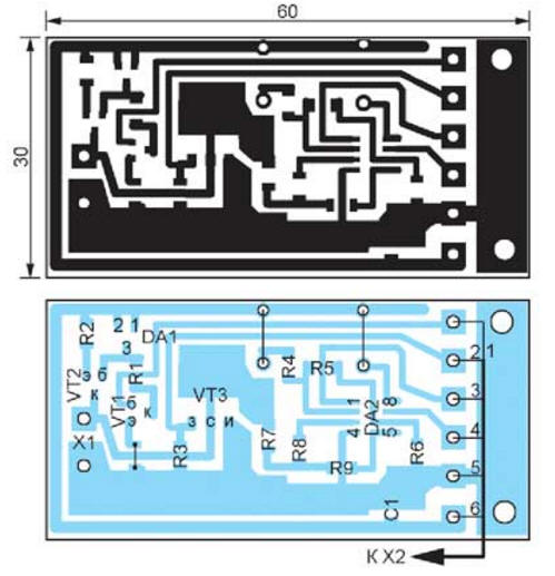 Из рис. 2 следует, что: BC = t2; AC = U2 - UR; В'С = t3; А'С = U2. Подставив эти значения в приведенную выше пропорцию, получим t3 / t2 = U2 / (U2 - UR). С учетом формулы для вычисления t3 после несложных преобразований легко определить, что падение напряжения на ЭПС равно UR = U2 - Iст (t2/Cx). И наконец, искомое значение ЭПС получим, разделив на Iст левую и правую части предыдущей формулы: R = (U2/Iст) - (t2/Cx). Этот расчет можно проводить и по первому порогу, заменив переменные U2 и t2 соответственно на U1 и t1. Найденные значения емкости и ЭПС измеряемого конденсатора программа выводит на экран ЖКИ комбинированного прибора. Приставка собрана на печатной плате размерами 30x60 мм, чертеж которой показан на рис. 3. Она рассчитана на установку компонентов для поверхностного монтажа.