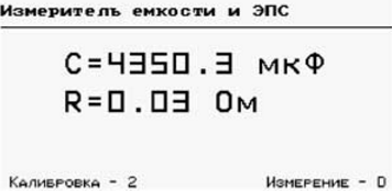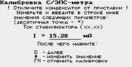 При первом переходе в режим измерения емкости и ЭПС программа микроконтроллера, не найдя в его EEPROM значений калибровочных коэффициентов, которые можно правильно интерпретировать, автоматически вызовет подпрограмму калибровки. Если этого не произошло, вызовите ее нажатием на клавишу "2". Экран ЖКИ примет вид, показанный на рис. 5.