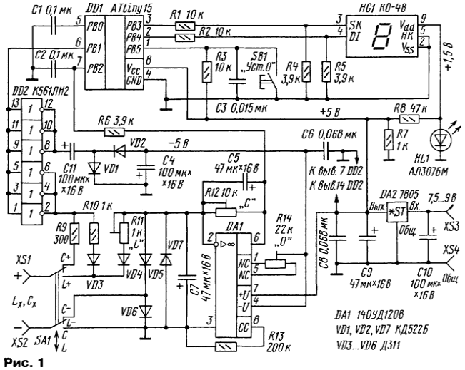 Принципиальная схема прибора показана на рис. 1 Сигнал возбуждающего напряжения рямоугольной формы с вывода 6 (РВ1) микроконтроллера DD1 через три нижних по схеме буферных элемента DD2 поступает на измерительную часть устройства. Во время высокого уровня напряжения зарядка измеряемого конденсатора Сх происходит через резистор R9 и диод VD6, а во время низкого - разрядка через R9 и VD5. Средний ток разрядки, пропорциональный величине измеряемой емкости, устройство преобразует с помощью операционного усилителя DA1 в напряжение. Конденсаторы С5 и С7 сглаживают его пульсации. Резистор R14 служит для точной установки нуля ОУ. При измерении индуктивности во время высокого уровня ток в катушке нарастает до значения, определяемого резистором R10, а во время низкого - ток, создаваемый ЭДС самоиндукции измеряемой катушки, через VD4 и R11 также поступает на вход микросхемы DA1. Таким образом, при постоянном напряжении питания и частоте сигнала напряжение на выходе ОУ прямопропорционально величинам измеряемых емкости или индуктивности. Но это справедливо только при условии, что зарядка конденсатора выполнена полностью в течение половины периода возбуждающего напряжения и также полностью произошла разрядка в течение другой половины. Аналогично и для катушки индуктивности. Ток в ней должен успевать нарастать до максимального значения и спадать до нуля. Эти условия можно обеспечить соответствующим выбором резисторов R9-R11 и частоты возбуждающего напряжения. Напряжение, пропорциональное значению параметра измеряемого элемента, с выхода ОУ через фильтр R6C2 подают на встроенный десятиразрядный АЦП микроконтроллера DD1. Конденсатор С1 - фильтр внутреннего источника образцового напряжения АЦП. Три верхних по схеме элемента DD2, а также VD1, VD2, С4, С11 использованы для формирования напряжения -5 В, необходимого для работы ОУ Результат измерения прибор отображает на десяти разрядном семисегментном ЖКИ HG1 (КО-4В, серийно выпускает фирма "Телесистемы" в г.Зеленограде). Аналогичный индикатор использован в телефонах "PANAPHONE". Для повышения точности прибор имеет девять поддиапазонов измерения. Частота возбуждающего напряжения на первом поддиапазоне равна 800 кГц. На такой частоте измеряют конденсаторы с емкостью примерно до 90 пФ и катушки с индуктивностью до 90 мкГн. На каждом последующем поддиапазоне частота снижена в 4 раза, соответственно во столько же раз расширен предел измерения. На девятом поддиапазоне частота равна 12 Гц, что обеспечивает измерение конденсаторов с емкостью до 5 мкФ и катушек с индуктивностью до 5 Гн. Нужный поддиапазон прибор выбирает автоматически, причем после включения питания измерение начинает с девятого поддиапазона. В процессе переключения номер поддиапазона отображен на индикаторе, что позволяет определить, на какой частоте выполняют измерение. После выбора нужного поддиапазона результат измерения в пФ или мкГн выведен на индикатор. Для удобства считывания десятые доли пФ (мкГн) и единицы мкФ (Гн) отделены пустым знакоместом, а результат округлен до трех значащих цифр. Светодиод HL1 красного цвета свечения использован в качестве стабистора на 1,5 В для питания индикатора. Кнопка SB1 служит для программной коррекции нуля, что помогает компенсировать емкость и индуктивность клемм и переключателя SA1. Этот переключатель можно исключить, е