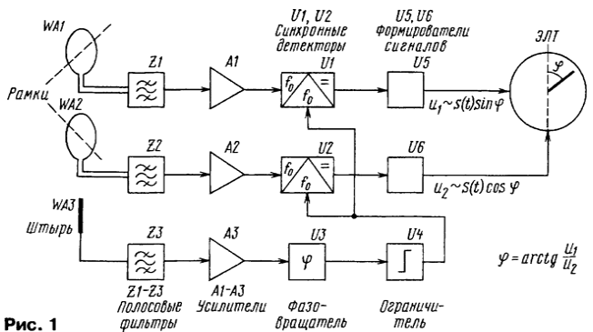 ЭНЦИКЛОПЕДИЯ РАДИОЭЛЕКТРОНИКИ И ЭЛЕКТРОТЕХНИКИ Забытая радиометеорология. Энциклопедия радиоэлектроники и электротехники Энциклопедия радиоэлектроники и электротехники / Измерительная техника Почему забытая? И что это вообще за наука? По определению, радиометеорология - это наука о связи метеорологических (погодных) процессов с процессами распространения радиоволн в атмосфере. Однако смысл, вкладываемый в это определение, несколько раз менялся на протяжении всей истории развития радиотехники. Вспомним, что первый радиоприемник А. С. Попова использовался в качестве грозоотметчика, т. е. первое практическое применение радио было радиометеорологическим! Наблюдение атмосфериков - импульсов радиоизлучения вызванных грозовыми разрядами, получило довольно широкое распространение в 20-30-е годы. Был известен, например, прибор швейцарского физика Люжона, названный атморадиографом и представлявший собой усовершенствованный грозоотметчик Попова, объединенный с метеорологическим анемокинемографом [1]. Наблюдения велись на сверхдлинных волнах (частоты в десятки килогерц), имеющих большую дальность распространения, так что можно было регистрировать удаленные очаги грозовой деятельности, в том числе и тропические. В годы второй мировой войны, когда Швейцария оказалась отрезанной от источников метеорогической информации, благодаря наблюдениям атмосфериков удавалось регистрировать возникновение циклонов даже у берегов Флориды. Пересекая Атлантику, эти циклоны потом определяли погоду в Европе. Позднее для более точного местоопределения очагов атмосфериков группа Люжона организовала в 1957-1959 гг. наблюдательные пункты в Цюрихе и на Шпицбергене. Пеленгация с базой в 4200 км позволила регистрировать грозы почти всего северного полушария. Техника наблюдения атмосфериков значительно усовершенствовалась, когда появились приемники-пеленгаторы с индикацией приходящих импульсов не на слух, а на экране ЭЛТ. Структурная схема современного грозопеленгатора показана на рис. 1 [2]. Это приемник прямого усиления, содержащий три идентичных канала с полосовыми фильтрами Z1-Z3, настроенными на принимаемую частоту (например, 27 кГц), и усилителями А1 - A3. Два канала получают сигнал от скрещенных под прямым углом рамочных антенн WA1 и WA2 (с равным успехом можно использовать магнитные), а третий - от всенаправленной штыревой антенны WA3. Сигнал третьего канала ограничивается по амплитуде ограничителем U4 и служит как образцовый для работы двух синхронных детекторов U1 и U2, установленных в первых двух каналах. На выходах синхронных детекторов демодулированные сигналы пропорциональны синусу и косинусу угла прихода радиоволн. Подав их, после соответствующего усиления и формирования в устройствах U5 и U6, на пластины горизонтального и вертикального отклонения ЭЛТ, мы получаем угол отклонения луча, пропорциональный арктангенсу отношения напряжений в каналах с рамочными антеннами, т. е. азимуту угла прихода волн. Первоначальная юстировка пеленгатора осуществляется поворотом рамочных антенн и фазовращателем U3 в цепи образцового сигнала. Как видим, пеленгатор достаточно прост, не содержит подвижных устройств для поворота антенн, тем не менее позволяет определять азимут с довольно высокой точностью. Атмосферик на экране наблюдается в виде выброса луч
