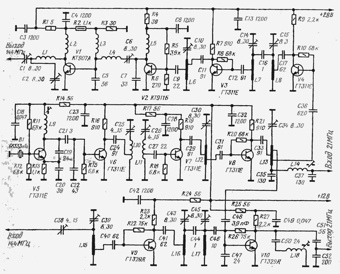Энциклопедия радиоэлектроники и электротехники / Гражданская радиосвязь Данный трансвертер на диапазон 144... 144,5 МГц предназначен для работы совместно с коротковолновым трансивером, имеющим диапазон 21...21.5 или 28...28.5 МГц. Выходная мощность трансвертера в режиме передачи - 5 Вт (при уровне мощности, поступающей с трансивера около 1 мВт). Коэффициент шума в режиме приема составляет 2...2,6 kTo (при коэффициенте шума приемной части KB трансивера не более 10...15 kТo). Трансвертер имеет линейный передающий тракт, т. е. обеспечивает линейную зависимость между амплитудой сигнала, подаваемого с KB трансивера, и амплитудой выходного сигнала (в диапазоне 144 МГц). Принципиальная схема трансвертера изображена на рис. 1. Его можно разделить на три основные части: приемный (транзисторы V9,. V10) и передающий (V1- V4) тракты и общий для них гетеродин (V5- V8). Кварцевый автогенератор гетеродина выполнен на транзисторе V5 по схеме емкостной "трехточки". Выбор нужной механической гармоники кварцевого резонатора обеспечивается соответствующей настройкой контура L9C19C20. В данном случае кварцевый резонатор 6833,3 кГц(6444.4 кГц) (здесь и далее в скобках указаны частоты для трансвертера, имеющего промежуточную частоту 28...28,5 МГц.) возбужден на третьей механической гармонике, т. е. на частоте 20,5 МГц (19,333МГц). С автогенератора сигнал поступает вначале на утроитель частоты (транзистор V6), нагрузкой которого служит полосовой фильтр L10C25L11C26. настроенный на частоту 61,5 МГц (58 МГц), затем на удвоитель (транзистор V7) и далее на усилитель (транзистор V8). Фильтрацию выходного сигнала гетеродина частотой 123 МГц (116 МГц) обеспечивают контуры L12C30 и L13CS4. Приемный тракт содержит усилитель ВЧ и смеситель. Усилитель собран на транзисторе V9, включенном по схеме с общим эмиттером. Выбранная схема стабилизации режима работы транзистора по постоянному току (с помощью резистора R22) позволяет непосредственно, без блокировочной емкости, заземлить эмиттер транзистора. Это обеспечивает высокий устойчивый коэффициент усиления каскада. Для повышения КПД входной цепи контур L15C39 сильно связан с базовой цепью транзистора V9. Связь усилителя с антенной - емкостная. Конденсаторы C38, С40 и катушка L15 образуют фильтр верхних частот, препятствующий проникновению на выход конвертера помех от мощных коротковолновых радиостанций. Нагрузка усилителя ВЧ - полосовой фильтр L16C4SL17C45. Сигналы гетеродина и высокочастотного усилителя суммируются в смесителе (транзистор V10). Согласование смесителя со входом приемника обеспечивает контур L18C50C51C52. Передающий тракт начинается со смесителя, выполненного на транзисторе V4. Напряжение гетеродина поступает на базу транзистора V4 с контура L13C34. Сформированный в трансивере телеграфный, AM или SSB сигнал поступает на смеситель через контур L14C35C37. Нагрузкой смесителя служит полосовой фильтр L8C15L7C14, настроенный на частоту 144 МГц.
