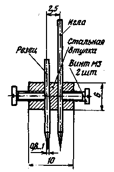 Для изготовления таких канавок можно воспользоваться простейшим приспособлением, устройство которого показано на рис. 2. Приспособление состоит из иглы, миниатюрного резца и крепежной детали. Игла и резец изготовлены из отслуживших срок зубоврачебных боров. Для их заточки удобно воспользоваться абразивным камнем или алмазным надфилем. Крепежная деталь изготовлена из стальной втулки диаметром 6 мм. Боры вставлены в два отверстия, просверленные во втулке, и закреплены двумя винтами МЗ. Для надежного крепления боров на их боковых поверхностях желательно сиять фаску. Хвостовик иглы должен быть длиннее хвостовика резца для того, чтобы его можно было закрепить в дрели. Однако не составит большого труда сделать кольцевые канавки вручную. Для этого удобно зажать приспособление в ручные ювелирные тиски. Не следует прикладывать излишнее усилие я стараться вырезать канавку за один раз, так как это приведет к появлению задиров фольги. Паяют детали "в накладку". Пунктиром на вкладке показаны проводники, расположенные с обратной стороны платы. Они пропускаются через отверстия, просверленные вблизи соответствующих контактных площадок. При подборе деталей для трансвертера полезно учесть, что номиналы большинства конденсаторов некритичны. Это, прежде всего, относится к блокировочным конденсаторам, стоящим в цепях питания, емкость которых можно менять в пределах от 500 до нескольких тысяч пикофарад. Некритичны также емкости разделительных конденсаторов, осуществляющих связь транзисторов с резонансными контурами. Их значения можно изменять в пределах от -50 до +100%. Дроссели L2, L3 и L5- бескаркасные, изготовлены из отрезка провода ПЭВ-2 0,3 длиной около 150 мм. Провод намотан на оправку диаметром 2,6 мм. Катушки L1, L10, L11- бескаркасные, намотаны на оправке диаметром 9 мм посеребренным проводом диаметром 0,8 мм. Катушка L1 содержит 3 витка (длина намотки 7 мм), L0 и L11-по 8 витков (длина намотки 14 мм). В катушке L10 отвод сделан от 1,25-го Витка, в катушке L11-от 3,75-го витка, считая от нижнего по схеме вывода. Катушки L9, L14, L18 намотаны на каркасах диаметром 5 мм проводом ПЭВ-2 0.15. Число витков - 18. Для подстройки использованы сердечники из карбонильного железа с резьбой М4. В трансвертере применены конденсаторы КМ и КТ, резисторы М+ и МЛТ. Налаживание трансвертера следует начинать с кварцевого автогенератора. Прежде всего надо через конденсатор емкостью 1000- 5000 пФ временно соединить базу транзистора V5 с корпусом. При этом кварцевый автогенератор превратится в обычный LC генератор. Частота генерации в этом случае будет определяться контуром L9C19C20. Вращением подстроечника катушки. L9 надо ее установить близкой к утроенной частоте кварцевого резонатора. После этого конденсатор от базы транзистора V5 отключают и находят такое положение подстроечника, в котором он в наименьшей степени влияет на частоту генерации. Затем приступают к настройке умножителей частоты. При их настройке, как, впрочем, и всех остальных каскадов трансвертера, необходимо контролировать режимы работы транзисторов по постоянному току. Удобнее всего измерять Напряжение на коллекторе, так как при известном сопротивлении резистора, стоящего в коллекторной цепи, легко определить ток, протекающий через транзистор. Измерения надо производить через резистор сопротивлением не менее 10 к0м. Его надо закрепить