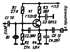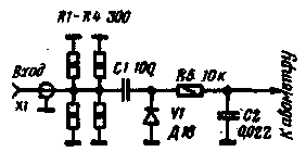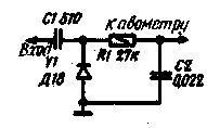 Приставка представляет собой кварцевый автогенератор, выполненный на транзисторе VI. В ней можно применить любой кварцевый резонатор с собственной частотой в пределах 8... 15 МГц. Одновременно транзистор выполняет функции смесителя, работающего на гармониках частоты кварцевого автогенератора. Автогенератор отрезком кабеля соединяют со входом коротковолнового приемника. При налаживании гетеродинного тракта приставку с помощью короткого отрезка монтажного провода надо связать с контуром настраиваемого умножителя. Для этого достаточно изолированный конец монтажного провода поднести к "горячему" выводу контурной катушки. Так как в приставке нет избирательных цепей, прием происходит одновременно на многих гармониках автогенератора. Разобраться в возникающей массе сигналов помогает то, что заранее известны частоты кварцевого генератора гетеродина и кварцевого генератора приставки. В качестве примера рассмотрим процесс настройки контура L10C25 на частоту 61,5 МГц. Пусть в приставке использован кварцевый резонатор на частоту 9620 кГц, а проверка кварцевого генератора трансвертера показала, что его частота составляет 20504 кГц. В этом случае сигнал на выходе утроителя будет иметь частоту 61 512 кГц. Такой сигнал можно прослушивать, используя четвертую или пятую гармонику гетеродина приставки. В первом случае сигнал следует искать на частоте 23032 кГц(61512-9620*4). Во втором варианте, который подходит для приемников, имеющих более узкий рабочий диапазон, сигнал надо искать на частоте 13412 кГц(61612- -9620*6). Таким способом можно контролировать правильность настройки умножителей вплоть до частот 400...500 МГц. В принципе, диапазон частот можно еще более расширить, если применять более высокочастотный транзистор и уменьшить емкость конденсаторов С2, С4. Правильность настройки умножителей можно также проверить резонансным волномером. После того как подано необходимое возбуждение на базу транзистора V7, приступают к настройке контура L12C30 на частоту 123МГц (116 МГц). Следующий за удвоителем каскад является усилителем на транзисторе V8, работающем в классе "А". Коллекторный ток транзистора V8 слабо зависит от величины возбуждения, поэтому его нельзя использовать для индикации настройки контура удвоителя L12C30. Настройку надо производить с помощью приемника или в простейшем случае с помощью высокочастотного пробника, подключаемого к авометру. Схема пробника показана на рис. 4. Авометр следует переключить на наиболее чувствительную шкалу измерения постоянного тока. Степень связи пробника с настраиваемым узлом можно регулировать, передвигая точку подключения пробника к контуру.