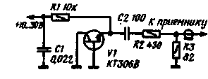 Схема генератора шума показана на рис. 5. Источником шума является эмиттерный переход транзистора V1, работающего в режиме пробоя обратным напряжением. Интенсивность генерируемого шума составляет несколько сот kTо. Это позволяет для улучшения согласования пробника с входом приемника добавить аттенюатор на резисторах R2, R3 с коэффициентом ослабления около 13 дБ. Пробник собирают в небольшой коробке. При монтаже надо обратить особое внимание на минимальную длину выводов транзистора V1, резисторов R2, R3 и конденсатора С2. Еще лучше результаты получаются, если применить в генераторе шума германиевый СВЧ диод ГА402 Он имеет меньшую емкость и индуктивность выводов. Налаживание такого пробника сводится к установке резистором R1 тока через диод в пределах 1...3 мА. Для устойчивой работы желательно, чтобы напряжение источника питания в 2...3раза превышало напряжение, при котором начинается пробой диода. С помощью пробника можно легко настроить приемный тракт на максимальный коэффициент усиления. Для этого на выход основного приемника необходимо подключить авометр в режиме измерения переменного напряжения, а затем настройкой контуров и подбором межкаскадных связей добиться максимальных показаний прибора. Полосу пропускания приемного тракта трансвертера также легко определить по уменьшению показаний авометра при расстройке базового приемника. Полоса в основном определяется параметрами фильтра L16C43L17C45, а также добротностью нагруженного контура L18C50. Полосу можно расширить, увеличивая емкость конденсатора С44 и уменьшая коэффициент деления емкостного делителя C51C52. Окончательная настройка производится с помощью измерительного генератора шума или при прослушивании сигналов, принимаемых из эфира. Следует также учесть, что самовозбуждение усилителя ВЧ при отключении антенны или ее эквивалента не является признаком неправильной настройки приемного тракта. При налаживании передающего тракта сначала устанавливают режимы работы транзисторов по постоянному току. Подбором резистора R10 добиваются, чтобы напряжение на коллекторе транзистора V4 было равным 4-7 В, что соответствует току 10 мА. Резистором R8 устанавливают режим работы транзистора V3 (на его коллекторе должно быть напряжение +9 В). При регулировке начального тока предоконечного и оконечного транзисторов лучше измерять постоянное напряжение на коллекторе относительно "плюсового" провода. Падение напряжения на резисторе R4 должно быть 4 В, а на R1-0,2 В. После этого временно отключают питание от транзисторов VI и V2 и приступают к настройке резонансных контуров. Первоначальную настройку производят в отсутствии сигнала частотой 21 МГц (28 МГц). Резонансные контуры L8C15, L7C14 к L6C10 настраивают на частоту гетеродина, т. е. на частоту 123 МГц (116 МГц), используя высокочастотный пробник, поочередно подключаемый к данным контурам. Затем на вход смесителя подают сигнал частотой 21,2 МГц (28,2 МГц). Амплитуду сигнала увеличивают до тех пор, пока не начнется заметное уменьшение коллекторного тока транзистора V4. Одновременно подстраивают контур L14C35C37. Сигнал гетеродина на выходе смесителя должен при этом несколько уменьшиться. Затем высокочастотный пробник слабо связывают с резонатором L8 и, вращая ось подстроечного конденсатора C15 (в сторону уменьшения емкости), находят ближайший максимум напряжения (он до