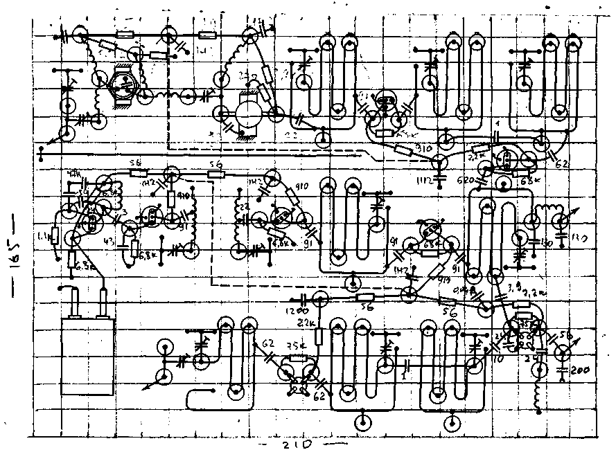 После того как контур L12C30 настроен на нужную частоту, переходят к налаживанию оконечного усилителя гетеродинного тракта. Прежде всего при отсутствии сигнала возбуждения подбором резистора R20 необходимо установить коллекторный ток транзистора V8 в интервале 7...8 мА. После этого на транзистор V8 надо подать возбуждающее напряжение и с помощью высокочастотного пробника настроить контур L13C34. Налаживание приемного тракта начинают с установки режимов транзисторов V9 я V10 по постоянному току. Подбором резисторов R22 и R26 следует установить коллекторные токи этих транзисторов в пределах 2...2,5 мА. После этого смеситель подключают ко входу коротковолнового приемника, настроенного на частоту 21,2 МГц (28.2 МГц) и по максимуму шума настраивают контур L8C50C51C52. Подключая высокочастотный пробник поочередно к контурам L17C45, L16C43. настраивают полосовой фильтр по максимуму сигнала гетеродина. Затем, постепенно уменьшая емкость подстроечных конденсаторов, перестраивают полосовой фильтр на частоту 144 МГц. При этом наиболее удобно воспользоваться шумовым источником сигнала.