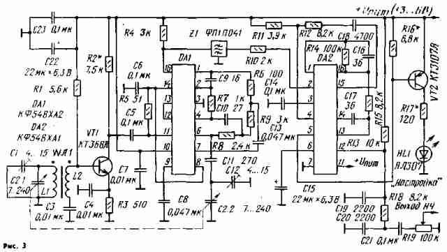 Типовые схемы включения микросхем КФ548ХА1 и КФ548ХА2 приведены на рис. 1 и 2. Средневолновый радиоприемник, построенный по типовой схеме (рис. 3), имеет следующие основные технические характеристики. Диапазон принимаемых частот, кГц......510...1640