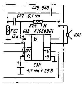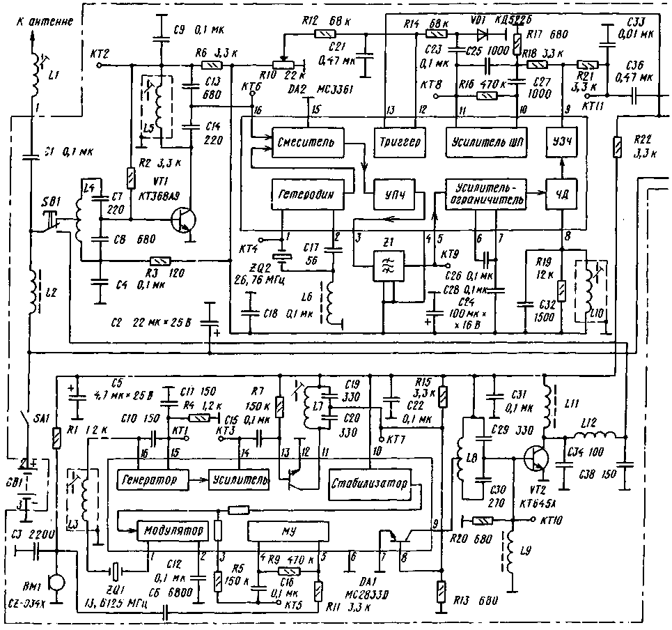 ЭНЦИКЛОПЕДИЯ РАДИОЭЛЕКТРОНИКИ И ЭЛЕКТРОТЕХНИКИ Радиостанция Колибри. Энциклопедия радиоэлектроники и электротехники Энциклопедия радиоэлектроники и электротехники / Гражданская радиосвязь В настоящее время номенклатура радиостанций Си-Би диапазона, предлагаемая торговыми предприятиями, готова, кажется, удовлетворить практически любой запрос пользователей. И все же их не всегда устраивает то экономичность аппаратуры, то ее габариты, масса, цена. Вниманию читателей предлагается краткое описание радиостанции "Колибри", выполненной на основе элементов поверхностного монтажа. Ее можно изготовить самостоятельно, используя обычные элементы, только придется заново разработать печатную плату (при этом габариты радиостанции увеличатся). Заменив кварцевые резонаторы, эту радиостанцию вы изготовите и на любительский диапазон 28 МГц. Простота схемных решений предлагаемой конструкции, использование современных импортных микросхем и применение радиоэлементов поверхностного монтажа позволяют собрать радиостанцию на одной печатной плате размерами всего 45х50 мм, добившись при этом вполне приемлемых технических характеристик. И пусть "Колибри" не поражает воображение будущих владельцев числом выполняемых ею функций и форсированной мощностью передатчика, они смогут по достоинству оценить габариты радиостанции, ее экономичность и сравнительно невысокую цену. Не сомневаемся, что эта радиостанция найдет свое применение для связи внутри офиса или с автомобильными радиостанциями на небольшие расстояния, а также для связи из дома с гуляющими на улице детьми или во время отдыха на природе. "Колибри" предназначена для работы на одном из каналов Си-Би диапазона в режиме узкополосной частотной модуляции. По основным электрическим параметрам станция соответствует перечню типовых характеристик аппаратуры диапазона 27 МГц. Рабочие частоты приемника и передатчика заданы кварцевыми резонаторами. Питание осуществляется от батареи аккумуляторов или гальванических элементов напряжением 3...6 В. Ток, потребляемый радиостанцией в дежурном режиме (с закрытым шумоподавителем), - не более 8 мА, при приеме сообщений - не более 100 мА, а в режиме передачи - не более 150 мА. Мощность передатчика при напряжении питания 4,5 В - 200 мВт, максимальная девиация частоты -1,8 кГц. Чувствительность приемника - не хуже 0,3 мкВ, мощность звукового сигнала на динамической головке сопротивлением 8 Ом - не менее 60 мВт. Дальность связи между двумя радиостанциями "Колибри" может составлять 1 км, а с эффективными стационарными антеннами - значительно больше. Время непрерывной работы с питанием от аккумуляторов емкостью 0,6 А-ч составляет около 20 ч при соотношении прием/передача 4:1. Эта характеристика соответствует довольно интенсивной связи! Схема радиостанции показана на рисунке. Сигнал от антенны через разделительный конденсатор С1 и кнопку SB1 поступает на вход усилителя высокой частоты приемника (транзистор VT1). Входной L4C7C8 и выходной L5C13C14 контуры усилителя настроены на рабочую частоту. Микросхема DA2 выполняет функции преобразования, усиления сигнала промежуточной частоты, частотного детектирования и шумоподавителя. Частота гетеродина стабилизирована кварцевым резонатором ZQ2, работающим на третьей механической гармонике. Полученную в результате преобразования про