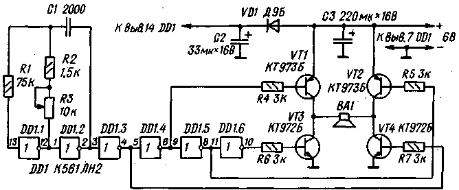 Описываемый здесь прибор, принципиальная схема которого изображена на рис.1, позволит каждому составить на этот счет собственное мнение. Задающий генератор собран на инверторах DD1.1 и DD1.2 КМОП-микросхемы К561ЛН2. Остальные элементы этой микросхемы формируют базовые токи транзисторов VT1- VT4, попеременно - через транзисторы VT1 и VT4 или через VT2 и VT3, подключая излучатель ВА1 к источнику питания.