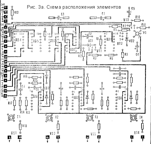 Распределитель импульсов выполнен на микросхемах DD4 и DD5. С выводов 11 и 12 счетчика-делителя DD4 импульсы поступают на входы элемента сравнения микросхемы DD5. Если импульсы низкого уровня, на выходе DD5 присутствует высокий логический уровень. В остальных случаях на выходе DD5 будет низкий уровень. Полученные импульсы поступают на блок управления тиристором (БУТ). Переключателем SA7 осуществляется реверс "бегущих огней".
