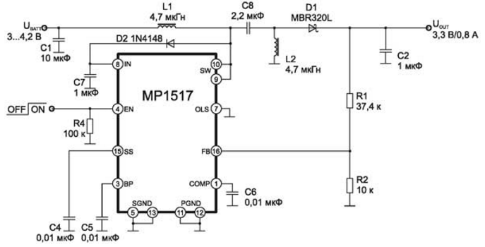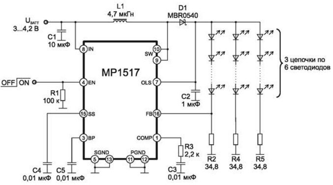 Резисторы R1, R2 и R3 (рис. 8) - датчики тока светодиодов. При аналоговом димминге на вход EN подают напряжение в пределах 0,3...1,2 В, а при ШИМ диммминге - сигнал ШИМ частотой 100...400 Гц с низким уровнем не более 0,18 В и высоким не более 1,2 В. Повышающий преобразователь и преобразователь типа SEPIC на микросхеме MP1517 Микросхему MP1517 изготовитель рекомендует использовать не только как повышающий DC/DC-преобразователь, но и как преобразователь типа SEPIC (Single-Ended Primary Inductance Converter - одновыводной первичный преобразователь на индуктивности). Напряжение питания этой микросхемы лежит в пределах 2,6...25 В. Она изготавливается в корпусе QFN16 размером 4x4 мм. Назначение выводов микросхемы MP1517 приведено в таблице 9, а типовая схема включения - на рис. 9. Таблица 9. Назначение выводов микросхемы MP1517