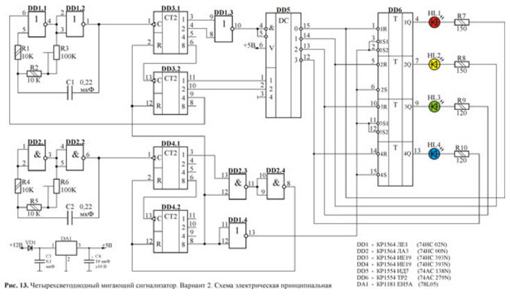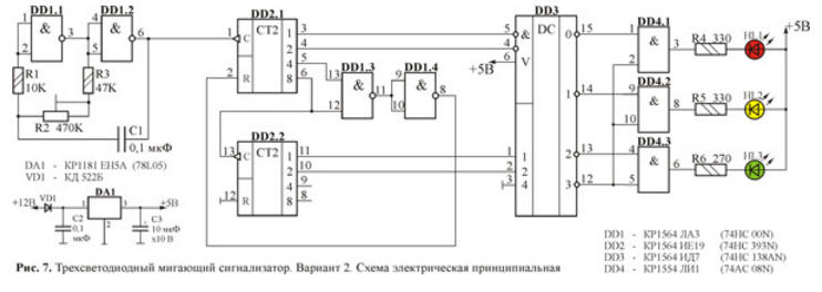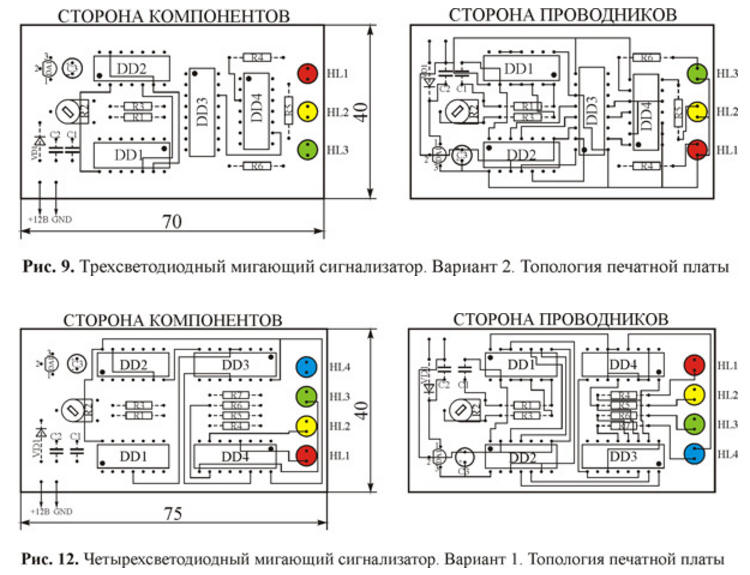 Конструкция и детали. Все устройства выполнены на печатных платах из двухстороннего фольгированного стеклотекстолита толщиной 1,5 мм. Размеры печатных плат: первый вариант (рис. 3): 35x50 мм; второй вариант: (рис. 6): 40x70 мм; третий вариант: (рис. 9): 40x70 мм; четвертый вариант: (рис. 12): 40x75 мм; и пятый вариант: (рис. 14): 50x90 мм. В устройствах применены постоянные резисторы типа МЛТ-0,125, подстроечные СП3-38б в горизонтальном исполнении, конденсаторы неполярные типа К10-17, оксидные - К50-35 или импортные. Микросхемы КМОП-серии КР1554 обладают высокой нагрузочной способностью (до 24 мА), что позволяет подключать светодиоды к их выходам непосредственно, без ключевых транзисторов. Если сверхъярких светодиодов в распоряжении не окажется, можно использовать и светодиоды стандартной яркости, но, в таком случае, необходимо использовать только ИМС серии КР1554, выходные токи которых могут достигать 24 мА. В схемах генераторов прямоугольных импульсов на месте КР1564ЛА3 (74HC00N) можно использовать также КР1564ТЛ3 (74HC132N), содержащую в своем составе четыре триггера Шмитта. Этот вариант наиболее предпочтителен при батарейном питании устройств, для повышения их экономичности за счет существенного уменьшения сквозных токов при переключении логических элементов. Благодаря высокой нагрузочной способности КМОП-микросхем серий КР1564 и КР1554, возможно сочетание в одном устройстве микросхем КМОП (КР1564, КР1554, КР1594) и ТТЛШ (КР1533, К555) и даже ТТЛ (К155) серий. Неприменимы в устройствах только микросхемы серий К561 и КР1561, нагрузочная способность которых не превышает 1 мА, даже для приборов серий CD40xxBN. К примеру, на месте DD1 (КР1564ЛА3) может работать ее полнофункциональный ТТЛШ-аналог типа КР1533ЛА3. Поскольку входные токи микросхем ТТЛШ-серий значительно больше соответствующих значений для КМОП-микросхем, необходимо установить подстроечный резистор (R2) сопротивлением 1 кОм, а постоянные (R1 и R3) заменить перемычками. При этом неполярный конденсатор С1 заменяется оксидным емкостью до 100 мкФ, чтобы сохранить постоянную времени генератора. При питании устройств от маломощных элементов общим напряжением 3 В, интегральный стабилизатор и защитный диод необходимо исключить, а светодиоды подобрать с минимально возможным рабочим напряжением свечения. При использовании на месте генератора микросхемы КР1564ТЛ3 (74HC132N), ресурса элементов питания будет достаточно для нескольких месяцев непрерывной работы. Устройства, собранные из исправных деталей и без ошибок в налаживании не нуждаются и работают сразу при включении. Литература.