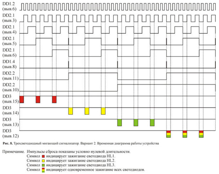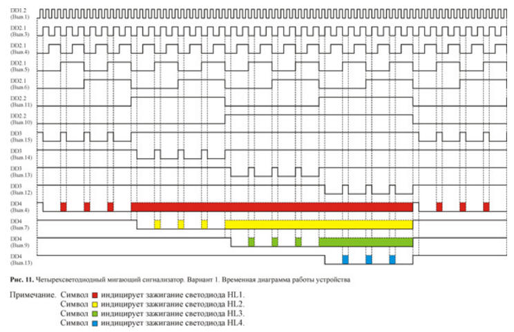 ЭНЦИКЛОПЕДИЯ РАДИОЭЛЕКТРОНИКИ И ЭЛЕКТРОТЕХНИКИ Мигающие светодиодные сигнализаторы на микросхемах КМОП. Энциклопедия радиоэлектроники и электротехники Энциклопедия радиоэлектроники и электротехники / Освещение Аннотация. Индикаторы режима работы находят самое широкое применение в электронных устройствах, к примеру, в составе системы охранной сигнализации, или, в индивидуальном исполнении, также для имитации ее наличия. Такой индикатор может найти применение в электронных игрушках для создания эстетических эффектов или в качестве контроллера управления проблесковыми маячками в автомобилях специального назначения. В качестве светоизлучающих элементов целесообразно использовать сверхъяркие светодиоды, которые, благодаря высокой нагрузочной способности КМОП-микросхем серий КР1554 и КР1564, можно подключать к их выходам непосредственно, без ключевых транзисторов. Принцип работы. В качестве базовых схемотехнических решений светодиодных индикаторов используются простейшие конструкции на двух и трех КМОП-микросхемах стандартной логики серии КР1554, соответственно, рассмотренные в [1] и [2]. Первый вариант (рис. 1) устройства формирует по две вспышки каждого светодиода со скважностью равной четырем. Это означает, что время свечения светодиода составляет 25% периода вспышки, что субъективно соответствует наиболее четкому вспыхиванию светодиодов. Кроме того, такая скважность в два раза продлевает срок службы маломощных элементов при батарейном питании устройства. Будем рассматривать работу устройства, считая, что в начальный момент времени счетчики DD2.1 и DD2.2 находятся в "нулевом" состоянии. На элементах DD1.1, DD1.2 выполнен генератор прямоугольных импульсов, с частотой следования около 10 Гц. При переключении элемента DD1.2 в противоположное состояние, напряжение на левой, по схеме, обкладке конденсатора С1, суммируется с предыдущим значением и достигает практически удвоенного значения напряжения источника питания. Для входных защитных диодов элемента DD1.1 такой режим работы недопустим, поэтому в устройство введен резистор R1, ограничивающий импульсы тока на уровне 1 мА, что уже является вполне приемлемым значением. Этот резистор предотвращает выход из строя защитных диодов и, тем самым, значительно повышает надежность устройства при длительной эксплуатации. Счетчик DD2.1 срабатывает по отрицательным перепадам счетных импульсов, и, при достижении "третьего" состояния, формирует на выходах "1" и "2" (выводы 11 и 10, соответственно) уровни логических единиц, которые, поступая на входы элемента DD1.3, вызывают появление на его выходе уровня "нуля". Этот логический уровень поступает на вход элемента DD1.4 и, инвертируясь последним, вызывает зажигание светодиода HL2. Происходит это благодаря тому, что счетчик DD2.2, как отмечено выше, находится в исходном "нулевом" состоянии, а на выходе элемента DD1.4 формируется уровень логической "единицы" (см. временную диаграмму на рис. 2). Переход счетчика DD2.1 в "четвертое" состояние приводит к погасанию светодиода HL2, а переход в "седьмое" - к его повторному зажиганию. Далее, отрицательным перепадом очередного счетного импульса, счетчик DD2.1 переводится в "восьмое" состояние, и, отрицательный перепад с выхода его "третьего" разряда (вывод 4) приводит к увеличению состояния счетчика DD2.2 на единицу. Теперь, в моменты поя