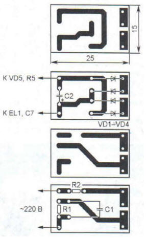 Резисторы R1, R2 (МЛТ), конденсаторы С1 (К73-17 или от КЛЛ), С2 (оксидный импортный) и диоды VD1-VD4 (также от КЛЛ) размещены на двусторонней печатной плате, чертеж которой показан на рис. 8. Монтаж в основном поверхностный. Конденсатор С2 устанавливают параллельно плате и приклеивают к ней клеем "Момент". Четыре отверстия в правой части платы предназначены для прохода выводов диодов VD1-VD4 (их припаивают к печатным проводникам обеих сторон). После проверки смонтированную плату обматывают двумя слоями изоляционной ленты и помещают в цокольную часть корпуса КЛЛ.