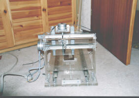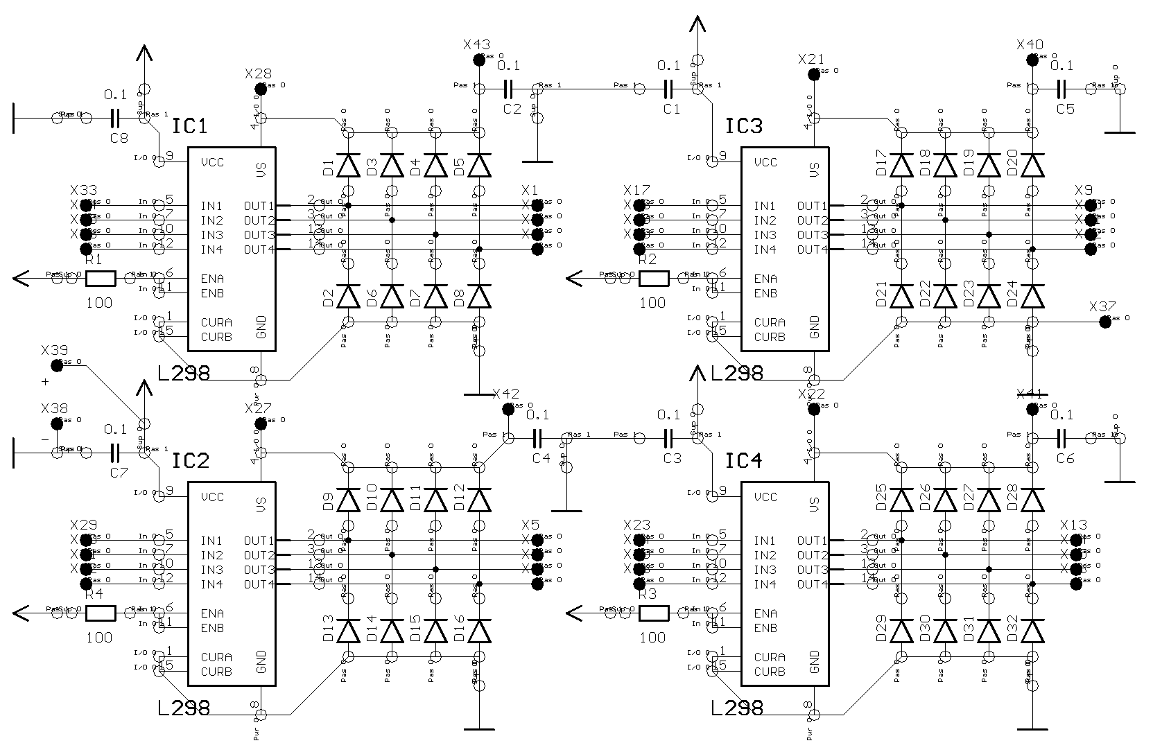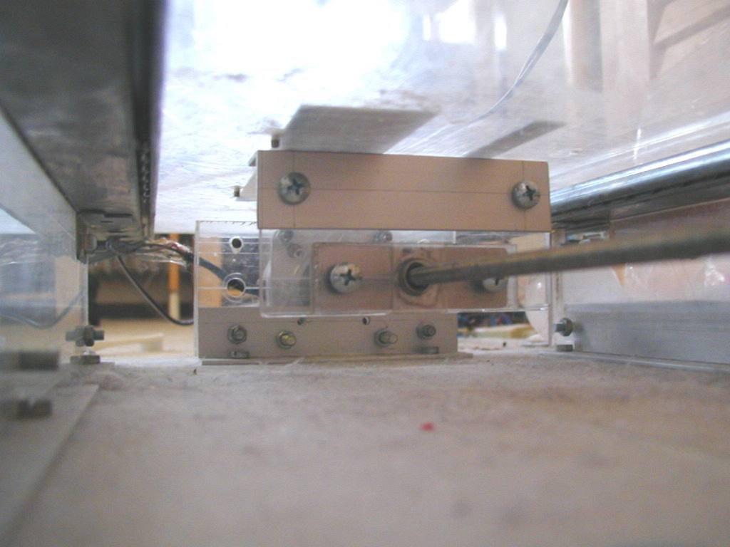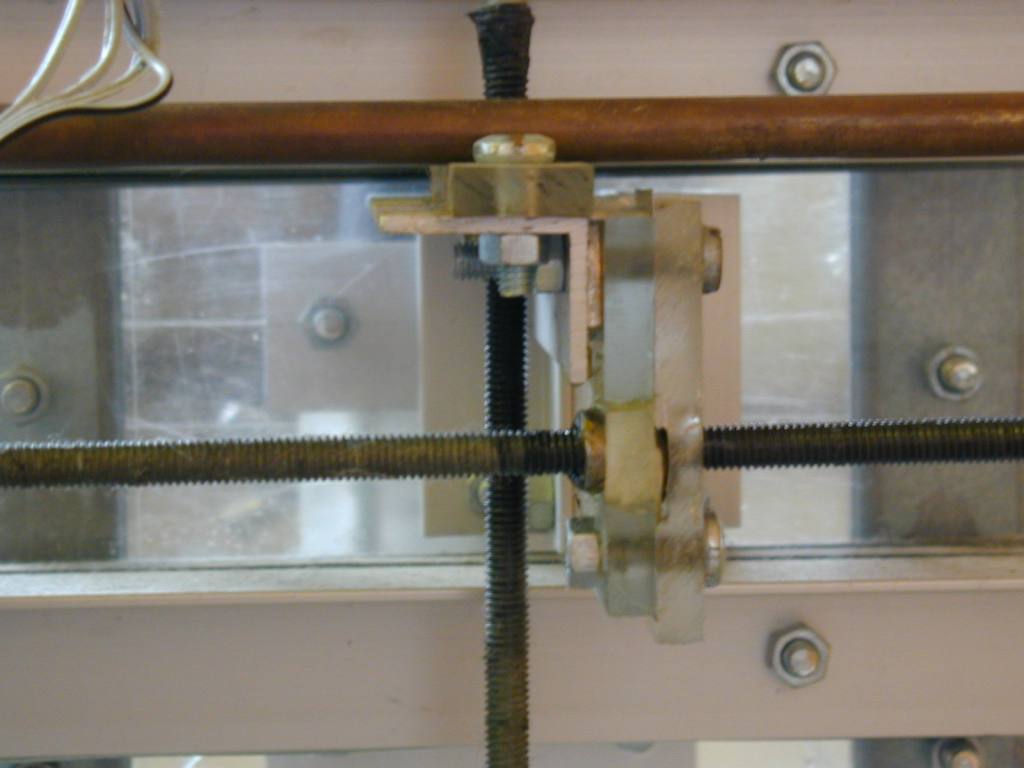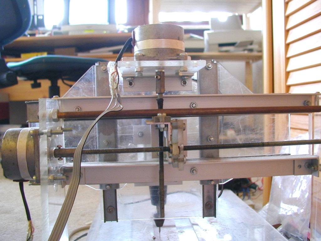Ïåðåìåùåíèå îñóùåñòâëÿåòñÿ ÷åðâÿ÷íûì ìåõàíèçìîì (äëèííûé áîëò Ì6 ñ ãàéêîé :), êîòîðûé âðàùàåòñÿ øàãîâûìè äâèãàòåëÿìè (ìàðêèðîâêà: Vexta Oriental Motor Ltd., C6431-9212, 3.18V, 1.05A, 2-õ ôàçíûé, 200 øàãîâ íà îáîðîò). Ìîòîðû ïèòàþòñÿ ÷åðåç êëþ÷è L298 ñòàáèëèçèðîâàííûì òîêîì â 1 À íà ìîòîð, Uìàêñ äî 12 Âîëüò (âîîáùå-òî äîëæíî áûòü 2À, íî ñòîÿò ëèíåéíûå ñòàáèëèçàòîðû òîêà íà LM317, è îíè áóäóò ñüåäàòü ñëèøêîì ìíîãî ýíåðãèè).