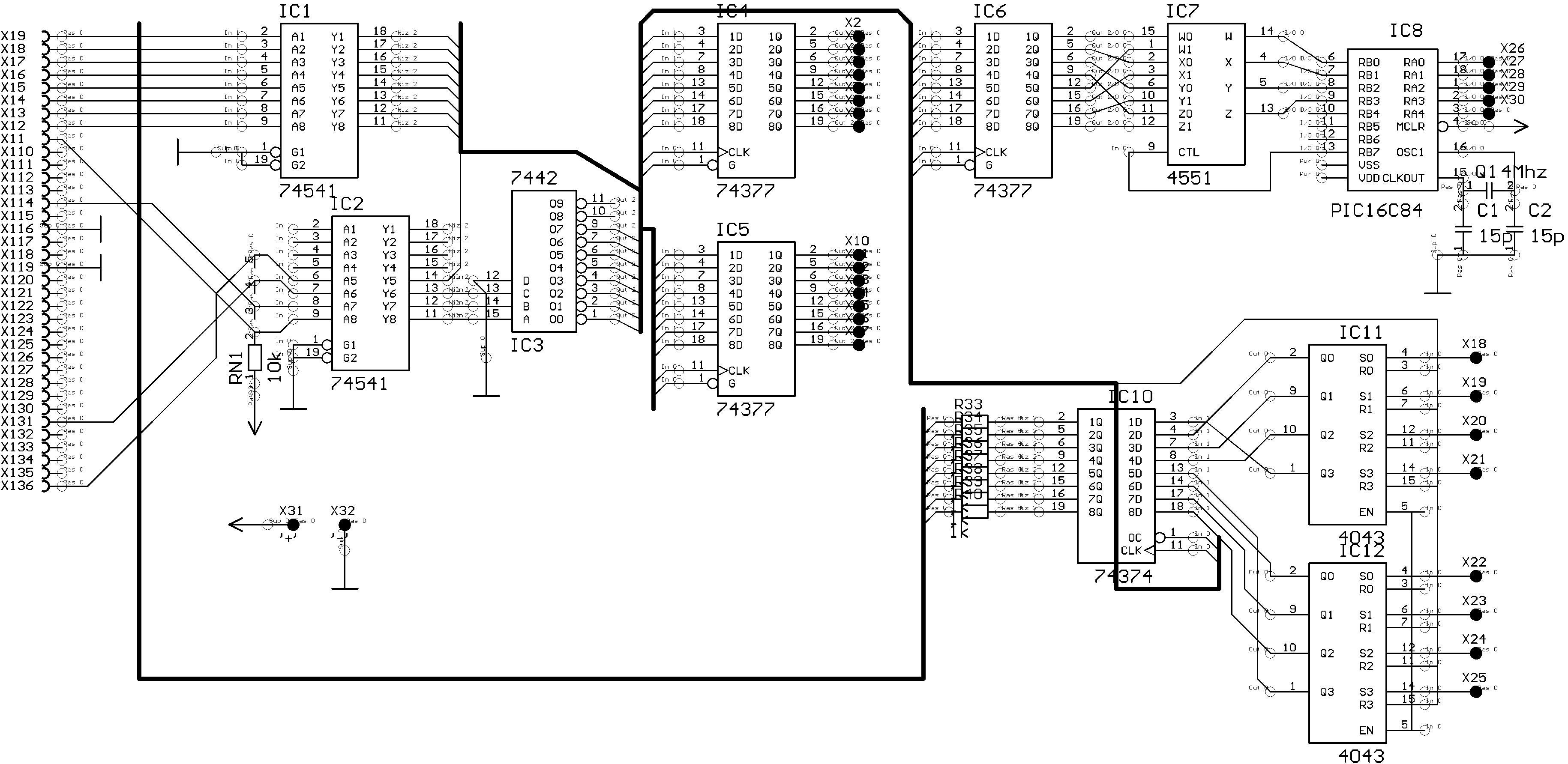 Ñõåìà äîâîëüíî ïðîñòàÿ - äåøèôðàòîð è áóôåðíûå ðåãèñòðû + RS-òðèããåð äëÿ êîíöåâèêîâ. Òà ÷àñòü ñõåìû, ãäå PIC16C84 ñòîèò òàê è íå áûëà ðåàëèçîâàíà - ýòî êàê ðàç è äîëæåí áûë áûòü PWM-ðåãóëÿòîð... äî íîâîé ñõåìû íà ìèêðîêîíòðîëëåðå ðóêè íå äîøëè.