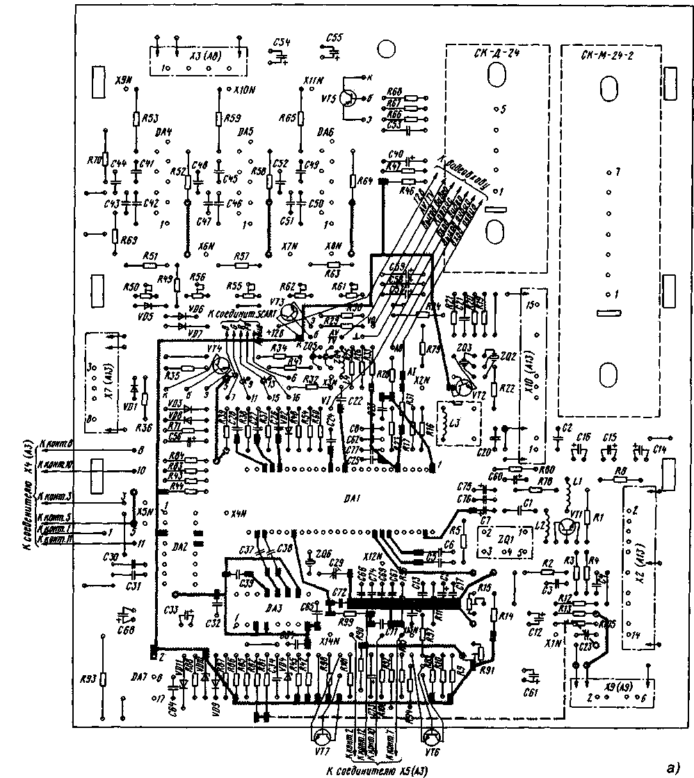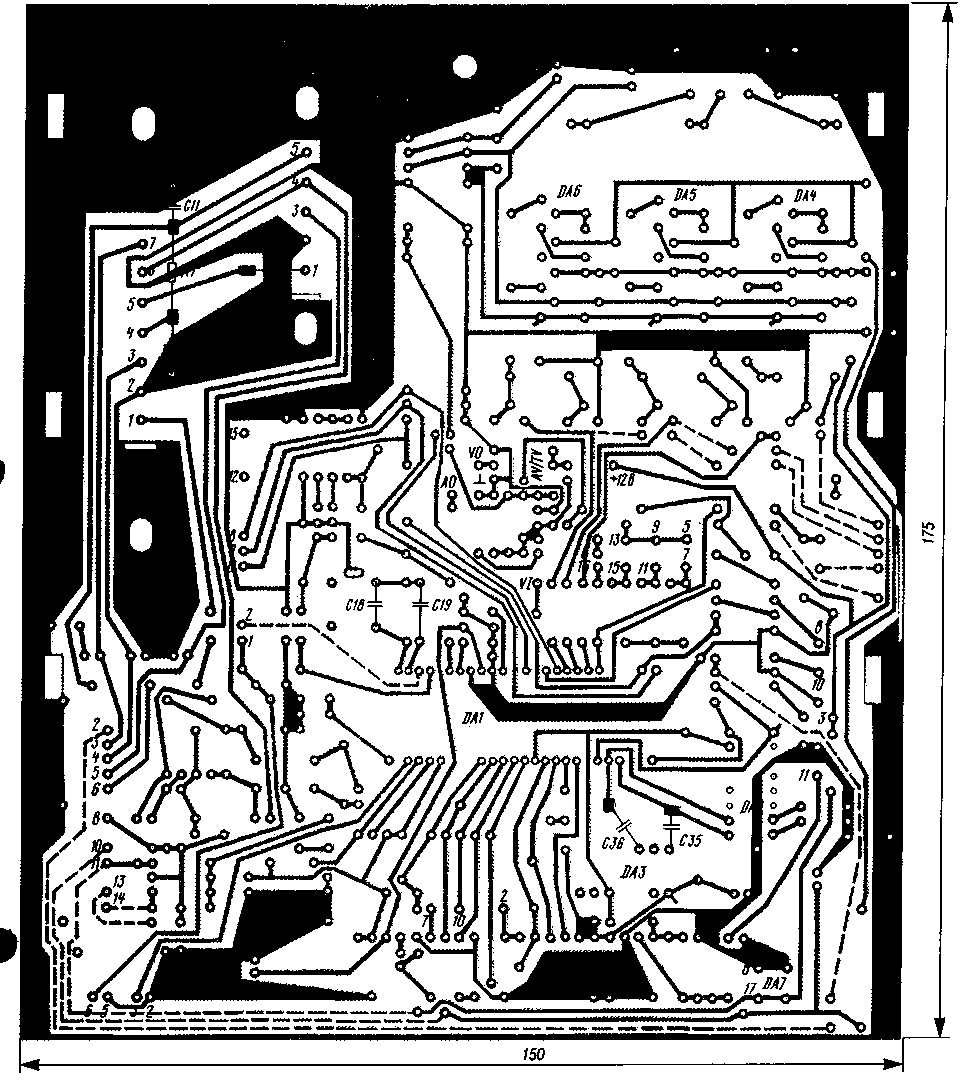 Энциклопедия радиоэлектроники и электротехники / Телевидение Установить МРКЦ в телевизорах УЛПЦТ довольно просто: нужно снять блоки БРК и БЦ и разместить МРКЦ вместо БРК, выполнив небольшие изменения в других блоках. Такая замена приводит к очень эффективному результату - упразднены два из трех наиболее громоздких блоков телевизора, значительно уменьшена потребляемая мощность, более чем вдвое сокращено число радиоламп. Все это существенно улучшает температурный режим в корпусе телевизора - его "ахиллесову пяту", основную причину частых возгорании. Вместо соединителей, указанных на рассмотренных ранее схемах, на плате МРКЦ устанавливают розетку Ш15 и присоединяют кабели к вилкам Ш2а, Ш7а, Ш15а для подачи необходимых напряжений и сигналов. Кабель Ш9, соединявший БРК с БЦ, снимают за ненадобностью. Вместо лампового УЗЧ следует применить модуль УМ1-3 от УПИМЦТ. Используемый в телевизоре барабанный селектор СК-М-15, имеющий очень низкий коэффициент усиления Ку (8 дБ), заменяют на СК-М-24, СК-Д-24 или на более современный с установкой УВП типа УСУ-1-15 или МСН-501. Значительное снижение потребляемого тока по всем напряжениям питания требует подбора номиналов гасящих резисторов в блоке коллектора с целью возврата к штатным номинальным напряжениям. Напряжение +12 В в УЛПЦТ формируется в блоке управления из напряжения +24 В со стабилизатором из гасящего резистора и стабилитрона Д814Б. Этот узел слишком слаб для питания МРКЦ и должен быть заменен на блок, рассчитанный на больший ток. Если владельца модернизируемого телевизора удовлетворяют принятые ранее параметры модуля - принимать только системы SECAM и PAL, стандарты В и G в телевизоре ЗУСЦТ с селекторами СК-М-24-2, СК-Д-24, - то можно без каких-нибудь изменений собирать МРКЦ по рассмотренным ранее принципиальным схемам. Печатная плата модуля показана на рис.12.а и рис.12.б Она пригодна для УВП любого типа со следующей оговоркой. При использовании МСН-501 на плате должны присутствовать все печатные проводники, показанные на рис. 12,а и б сплошными и штриховыми линиями, а также все детали, кроме резистора R78. При использовании УВП типов УСУ, СВП печатные проводники, показанные штриховыми линиями, не делают, а детали VD1, VD5-VD7, R35, R81- R84, С23, соединитель Х7 (А13) не устанавливают. Соединитель Х10 (А13) заменяют на Х5 (А9). Изменения, которые при этом необходимо сделать на печатной плате, изображены на рис. 13,а: резисторы R46, R47, R79 и конденсатор С40 располагают так же, как и на рис. 12,а. Конденсаторы С57-С59 размещают по-новому, совместно с резисторами R72-77. Вместо соединителя Х2 (А13) устанавливают соединитель Х2 (А10). При этом его контакты 2, 3, 5, 6 включают аналогично контактам 3-6 соединителя Х2 (А13), как показано на рис. 13.б. При желании использовать какую-нибудь из перечисленных ранее модификаций полезно составить полную принципиальную схему будущего модуля на основе рассмотренных ранее схем и рекомендаций, выбрав из них необходимые элементы. Затем внести необходимые изменения в печатную плату модуля (в рисунок печатных проводников). Детали модуля размещают на плате из двустороннего фольгированного стеклотекстолита толщиной 2 мм. Трассировка печатных проводников модуля выполнена с учетом размещения выводов деталей в узлах сетки 2,5х2,5 мм и уменьшенного расстояния между выводами микросхемы TDA8362 (1,778 вместо привычных 2,5 мм). Это заставило 