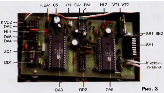 ЭНЦИКЛОПЕДИЯ РАДИОЭЛЕКТРОНИКИ И ЭЛЕКТРОТЕХНИКИ Микроконтроллер управляет вездеходом. Энциклопедия радиоэлектроники и электротехники Энциклопедия радиоэлектроники и электротехники / Микроконтроллеры Широкие функциональные возможности, относительная простота программирования и невысокая стоимость сделали однокристальные микроконтроллеры привлекательными для радиолюбительского творчества. Предлагаемое устройство было разработано как наглядное пособие для радиотехнического кружка, чтобы облегчить юным радиолюбителям изучение микроконтроллеров и сделать это изучение наглядным, живым и занимательным. Основой изделия стала крупная электромеханическая игрушка - гусеничный космический вездеход, приводимый в движение двумя электродвигателями. Управляет его работой доступный отечественный микроконтроллер КР1878ВЕ1. Программа предусматривает ряд последовательных действий, обеспечивающих автоматическое наведение машины на источник света и сближение с ним. Все действия сопровождаются соответствующими голосовыми сообщениями, записанными в память уже знакомых читателям специализированных микросхем Chipcorder компании Win bond Electronics. Работает описываемое ниже устройство следующим образом. После включения питания дважды мигает контрольный светодиод, сигнализируя о нормальной работе микроконтроллера. Затем в течение 20 с машина рассказывает, для чего и кем она создана, а также о том, что управляет ею однокристальный микроконтроллер КР1878ВЕ1. Далее она сообщает о своей задаче - найти источник света и сблизиться с ним, после чего определяет уровень освещенности в направлении перед собой, выполняет поворот направо приблизительно на 10°, еще раз измеряет освещенность. Если после поворота вправо она стала меньше, следует поворот налево на те же 10°, если же увеличилась, то делается еще один поворот вправо, снова измеряется освещенность и т. д. Иными словами, машина поворачивается в сторону роста освещенности до тех пор, пока он не прекратится (при этом немного проскакивая направление на максимум освещенности), затем делает один поворот в обратную сторону. В результате определяется направление на первый найденный максимум освещенности. После этого машина начинает сближение с целью - движется в ее сторону в течение определенного времени. Далее эта последовательность действий выполняется заданное число раз. Все действия комментируются голосовыми сообщениями. После выполнения последнего шага программы машина сообщает о том, что программа выполнена. (Поворот машины на 10° определяется временем работы соответствующего электродвигателя и скоростью движения гусеницы электромеханической игрушки, которую использовал автор). Принципиальная схема управляющей части устройства изображена на рис. 1. Ее основа - микроконтроллер DD1 КР1878ВЕ1 [1-3]. Схема включения - типовая. Тактовую частоту задает кварцевый резонатор ZG1. Светодиод HL1 служит для индикации того, что микроконтроллер нормально запустился и программа работает. Источником сигнала служит фотодиод VD2. С помощью ОУ DA2.1 его фототок преобразуется в напряжение. Резистор R13 и конденсатор С9 образуют фильтр нижних частот. Повторитель на ОУ DA2.2 обеспечивает его согласование с входом АЦП DA4. Образцовое напряжение создается с помощью интегрального стабилитрона DA6 и токоограничивающего ре