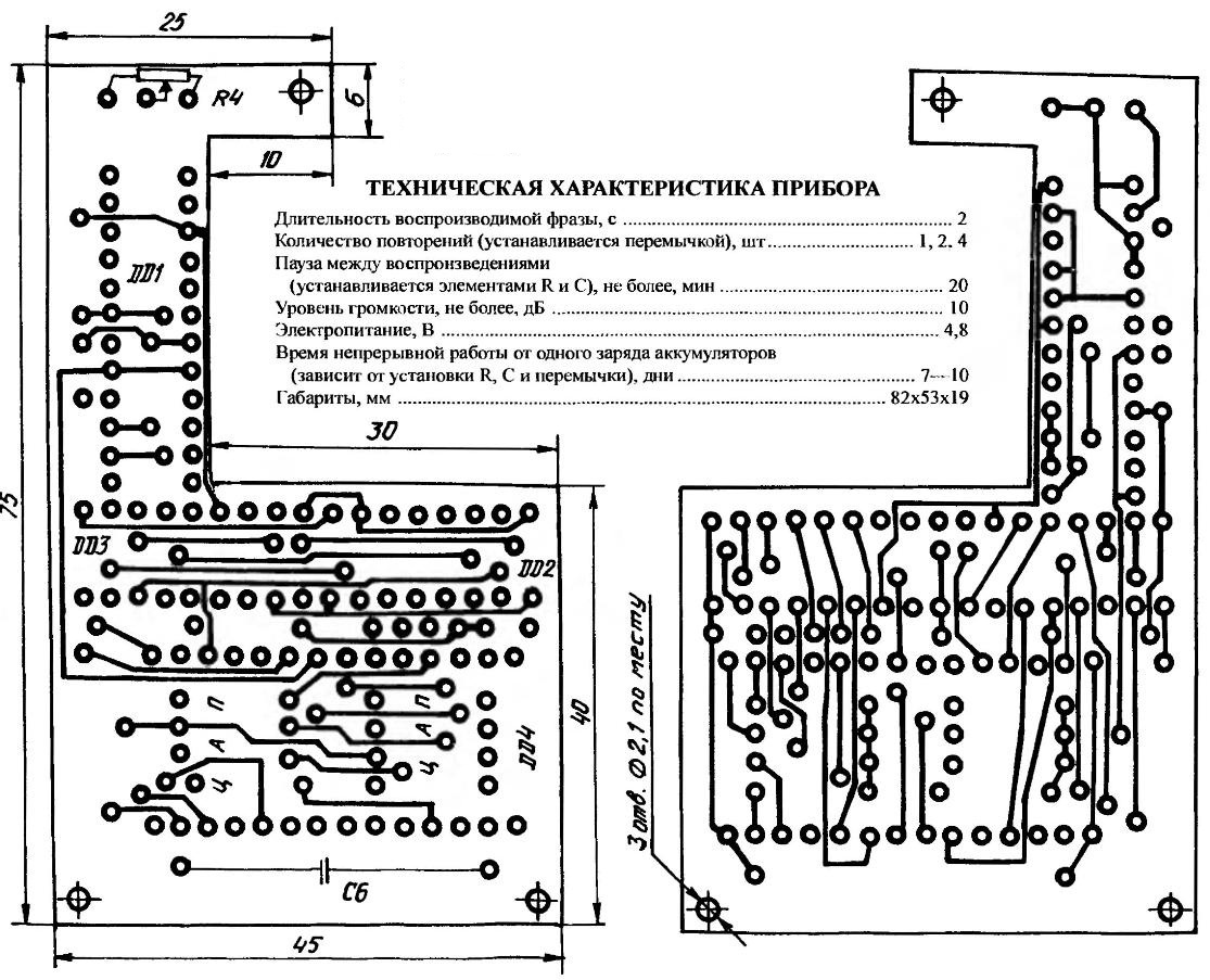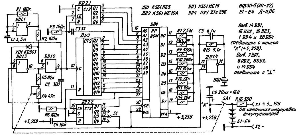 Как видно из принципиальной электрической схемы, брелок-мобилизатор способностей включает в себя двухчастотный задающий генератор DD1.1-DD1.3, многоразрядный двоичный счетчик DD2, DD3, перепрограммируемое запоминающее устройство (ПЗУ) DD4, цифроаналоговый преобразователь (ЦАП) R7-R14 и выходной каскад DD1.4, нагрузкой которого является звуковой преобразователь BQ1 типа ЗП-5 или ЗП-22. При включении источника электропитания через конденсатор С4 и резистор R6 начинает протекать ток заряда и осуществляться установка (сброс) микросхем DD2, DD3 в исходное состояние. Выходной потенциал старшего разряда счетчика (вывод 13 DD2.2) становится равным логическому "0" и открывает DD1.3 (вывод 9) и ПЗУ (выводы 20 и 22). Через диод VD1 вход логического элемента DD1.3 отключается от вывода 6 DD1.2. Генератором (DD1.2 и DD1.3) формируются тактовые импульсы с частотой, зависящей от конденсатора С2 и резисторов R3, R4. Предпочтение отдается 16,11 или 8 кГц. Плавная регулировка частоты осуществляется переменным резистором R4. Теперь приступает к работе счетчик на логических элементах DD2.1 и DD3 с синхронизирующей дифференциальной цепочкой C3R5. А так как его выходные разряды подключены к ПЗУ, то происходит извлечение соответствующей информации - составных частей формулы вербального внушения, заблаговременно записанных в виде кодов в электронной памяти. Цифроаналоговый преобразователь на резисторах R7-R14 превращает кодовые комбинации в аналоговый сигнал. Для согласования ЦАП со звуковым преобразователем служит выходной каскад DD1.4, работающий в линейном режиме. Причем для уменьшения шумов последний снабжен фильтром НЧ (С5R15) с частотой среза порядка 16 кГц. После использования всей емкости ПЗУ (32768 отсчетов) цикл считывания и декодирования информации повторяется, если перемычка S1 подключена к выводу 13 DD2.2 (двукратное воспроизведение вербальной формулы). При подсоединении же S1 к выводу 12 DD2.2 внушаемая фраза воспроизводится один, а к выводу 14 -четыре раза. Логическая "1", появляющаяся на соответствующем выводе (12, 13 или 14) DD2.2, запирает ПЗУ (выв. 20, 22), а также выходной каскад DD1.4 (выв. 13) для снижения потребляемой мощности в режиме паузы и одновременно отключает DD1.3 (выв. 9). На элементах DD1.1 и DD1.2 начинает работать задающий генератор. Его частота, определяемая номиналами С1, R1, R3, R4, является отправным параметром при задании временного промежутка между фразами внушения. При этом длительность паузы будет одно-, двух- или четырехкратной в зависимости от подключения перемычки S1 к выводам 12,13 или 14 логического элемента DD2.2. Строго говоря, пауза продолжается до появления логического "0" на выводе, соединенном с перемычкой S1, после чего рабочий цикл (воспроизведение + пауза) повторяется. Длительность же самого одноразового воспроизведения определяется выбором частоты задающего генератора, работающего на элементах DD1.2 и DD1.3 микросхемы К561ЛЕ5, и настраивается конденсатором С2 совместно с резисторами RЗ, R4. Причем R4 используется в основном для регулировки "скороговорности". Рекомендуется, чтобы параметр этот при верхнем (по схеме) положении движка переменного резистора соответствовал 120, а при правом - 480 словам в минуту.