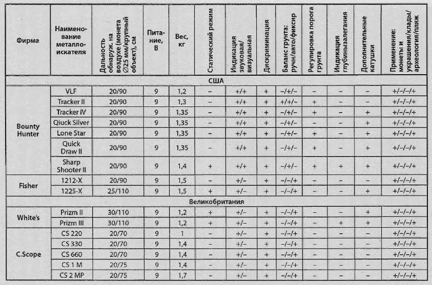 Они представляют собой типичные "монетники", то есть как раз и предназначены для поиска небольших по величине объектов, например, монет и украшений. Таблица 3.1. Сравнение характеристик металлоискателей для начинающих пользователей Есть и приятные исключения, но они характеризуются, как правило, большими размерами поисковых катушек (например у АКА, MD и Minelab'a), что определяет их большую универсальность. Стоит отметить несколько наиболее привлекательных моделей, "выбивающихся" из общего ряда, и прекрасно зарекомендовавших себя приборов: