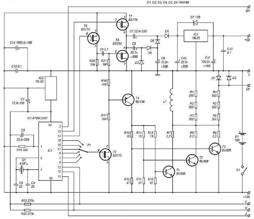Главной составной частью всей конструкции является модуль формирования импульсов и синхронизации, выполненный на микропроцессоре IC1 типа АТ89С2051 фирмы ATMEL и обеспечивающий формирование импульсов для передатчика, а также сигналов, управляющих работой всех остальных блоков. Рабочая частота микроконтроллера IC1 стабилизирована кварцевым резонатором (6 МГц). При указанном значении рабочей частоты микропроцессор формирует периодическую последовательность управляющих импульсов для различных каскадов металлодетектора. Первоначально на выводе IC1/14 микропроцессора формируется управляющий импульс для транзистора Т6, после окончания которого на выводе IC1/15 формируется аналогичный импульс для транзистора Т7. Затем этот процесс повторяется еще раз. В результате происходит запуск преобразователя напряжения. Далее, последовательно на выводах IC1/8, IC1/7, IC1/6, IC1/17, IC1/16 и IC1/18 формируются импульсы запуска передатчика. При этом указанные импульсы имеют одинаковую длительность, но каждый последующий импульс задержан относительно предыдущего на несколько тактов. Начало первого импульса, сформированного на выводе IC1/8, совпадает с серединой второго импульса на выводе IC1/15. С помощью переключателя Р1 можно выбрать время задержки импульса запуска передатчика по отношению к стартовому импульсу. Через несколько тактов после окончания импульса на выводе IC1/18 короткий стробирующий импульс для усилителя-анализатора формируется на выводе IC1/2. В отличие от ранее рассмотренной схемы в данном приборе на этом же выводе микроконтроллера через несколько тактов формируется второй стробирующий импульс. Помимо этого на выводах IC1/12 и IC1/13 микропроцессора формируются управляющие сигналы для транзисторов Т31 и Т32 блока приемника. Середина управляющего импульса для транзистора Т31 совпадает с серединой первого стробирующего импульса на выводе IC1/2, однако длительность импульса на выводе IC1/12 почти в два раза больше. При этом указанный импульс имеет отрицательную полярность. Начало управляющего импульсного сигнала на выводе IC1/13 почти совпадает с серединой второго импульса на выводе IC1/14 микроконтроллера, заканчивается же он через несколько тактов после окончания второго стробирующего импульса, формируемого на выводе IC1/2. Затем на выводе IC1/11 формируется управляющий сигнал для транзистора Т35 схемы акустической сигнализации блока приемника. После небольшой паузы последовательность управляющих импульсов на соответствующих выходах микроконтроллера формируется вновь. Питающее напряжение +5 В, предварительно стабилизированное микросхемой IC2, подается на вывод IC1/20 микроконтроллера. Преобразователь напряжения, выполненный на транзисторах Т6-Т8 и стабилизаторе IC3, обеспечивает формирование питающего напряжения +5 В, необходимого для питания каскадов приемной части. Управляющие сигналы для транзисторов Т7 и Т8 формируются на соответствующих выводах микроконтроллера IC1, при этом на транзистор Т8 этот сигнал подается через преобразователь уровня, собранный на транзисторе Т6. Далее сформированное питающее напряжение стабилизируется микросхемой IC3, с выхода которой напряжение +5 В поступает на каскады приемника. Выходные каскады передатчика выполнены на мощных транзисторах Т1, Т2 и Т3, работающих на общую нагрузку, в качестве которой выступает катушка L1, шунти