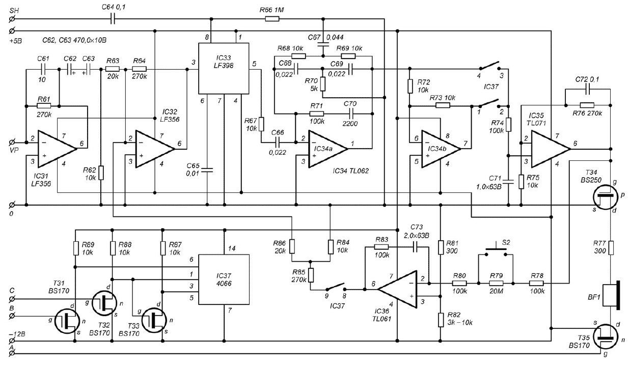 Сигнал от металлического предмета принимается катушкой L1 и через схему защиты, выполненную на диодах D1 и D2, подается на входной двухкаскадный усилитель с емкостной обратной связью, выполненный на операционных усилителях IC31 и IC32. С выхода микросхемы IC32 (вывод IC32/6) усиленный импульсный сигнал подается на усилитель-анализатор, выполненный на микросхеме IC33. В процессе работы прибора усилитель IC33 постоянно выключен, а напряжение питания подается на него лишь при поступлении на соответствующий вход (вывод IC33/8) стробирующих импульсов. По окончании подачи напряжения питания на выходе усилителя (вывод IC33/5) в течение нескольких секунд сохраняется уровень принятого сигнала, зафиксированный во время воздействия стробирующих импульсов. Время сохранения уровня сигнала зависит от емкости конденсатора С65. Таким образом, на один вход усилителя (вывод IC33/3) подается принятый импульсный сигнал, а на второй вход (вывод IC33/8) через конденсаторы С64 поступает соответствующий стробирующий импульс от модуля формирования импульсов и синхронизации (вывод IC1/2). Далее выделенный сигнал проходит через активный фильтр, выполненный на элементе IC34a и настроенный на частоту 6 МГц. Для достижения указанных на принципиальной схеме параметров отдельных элементов данного фильтра рекомендуется использовать параллельное включение резисторов и конденсаторов. Так, например, значение указанной на схеме емкости конденсатора С67 (0,044 мкФ) достигается параллельным включением двух конденсаторов емкостью 0,022 мкФ каждый. Необходимо отметить, что при использовании кварцевого элемента Q1 с рабочей частотой, отличающейся от 6 МГц, величины отдельных элементов фильтра следует пересчитать. С выхода фильтра сигнал подается на синхронный детектор, на входе которого установлен инвертирующий усилитель с коэффициентом усиления 1, выполненный на элементе IC34b. При этом с помощью замыкания соответствующих пар контактов микросхемы IC37 (выводы IC37/1,2 и IC37/3,4) осуществляется переключение отрицательного сигнала, подаваемого на интегрирующую цепочку с конденсатором С71. Управляющие сигналы для микросхемы IC37 формируются каскадами, выполненными на транзисторах Т31-Т33. С выхода интегрирующей цепочки импульсный сигнал проходит на вход усилительного каскада, который выполнен на микросхеме IC35 и одновременно выполняет функции фильтра низких частот. Падение напряжения на выходе операционного усилителя (вывод IC35/6) приводит к открытию транзистора Т34 и подключению к общему проводу головных телефонов BF1. При поступлении с соответствующего выхода микроконтроллера (вывод IC1/11) на транзистор Т35 управляющего сигнала в телефонах будет прослушиваться сигнал звуковой частоты. Резистор R77 ограничивает ток, протекающий через головные телефоны BF1. Его подбором можно регулировать громкость акустического сигнала. Сигнал с вывода IC35/6 также подается на вход другого операционного усилителя (вывод IC36/2), задачей которого является обнуление выходного сигнала. Его использование объясняется тем, что на выходе микросхемы IC33 изменяющийся во времени выходной сигнал будет формироваться и в отсутствие в зоне действия поисковой катушки L1 металлических предметов, поэтому амплитуда результирующего сигнала будет отлична от нуля. С помощью резистора R86 на вход второго усилительного каскада (вывод IC32/2) подает